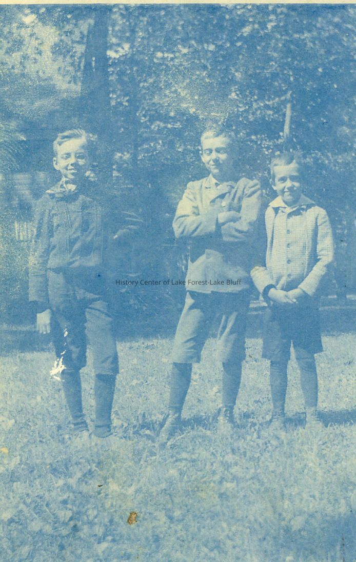 A blue tinted photograph of three young boys dressed in the style of the early 20th Century. Harvey Family members of Lake Bluff ?