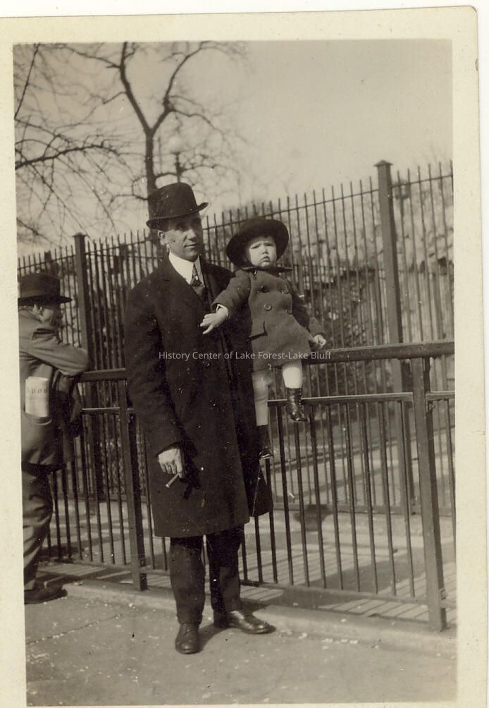 Photo of a gentleman dressed in a dark top coat and derby hat holding a young girl about 2 years old. Harvey Family members of Lake Bluff ?
