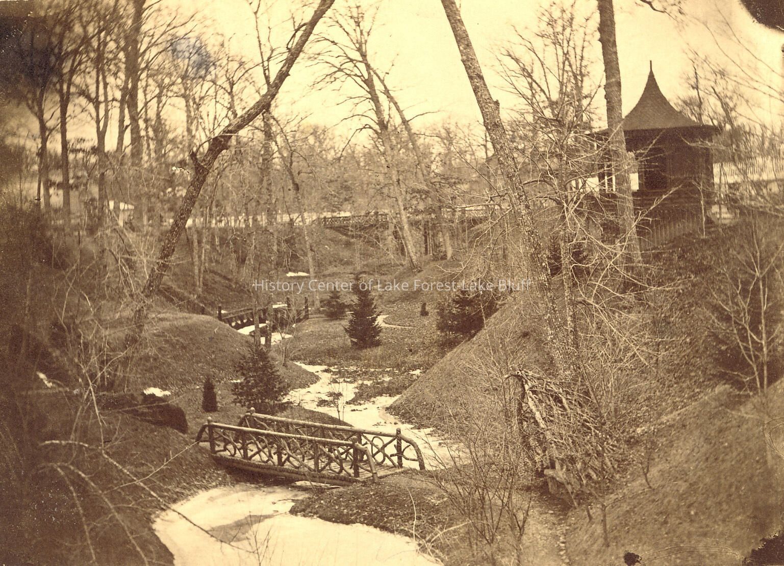 Photograph print on cardstock. Back labelled "H. M. Thompson ravine." The Harvey M. Thompson house was located at 660 North Sheridan Road. Photo shows several bridges spanning a wooded ravine, as well as a gazebo structure.