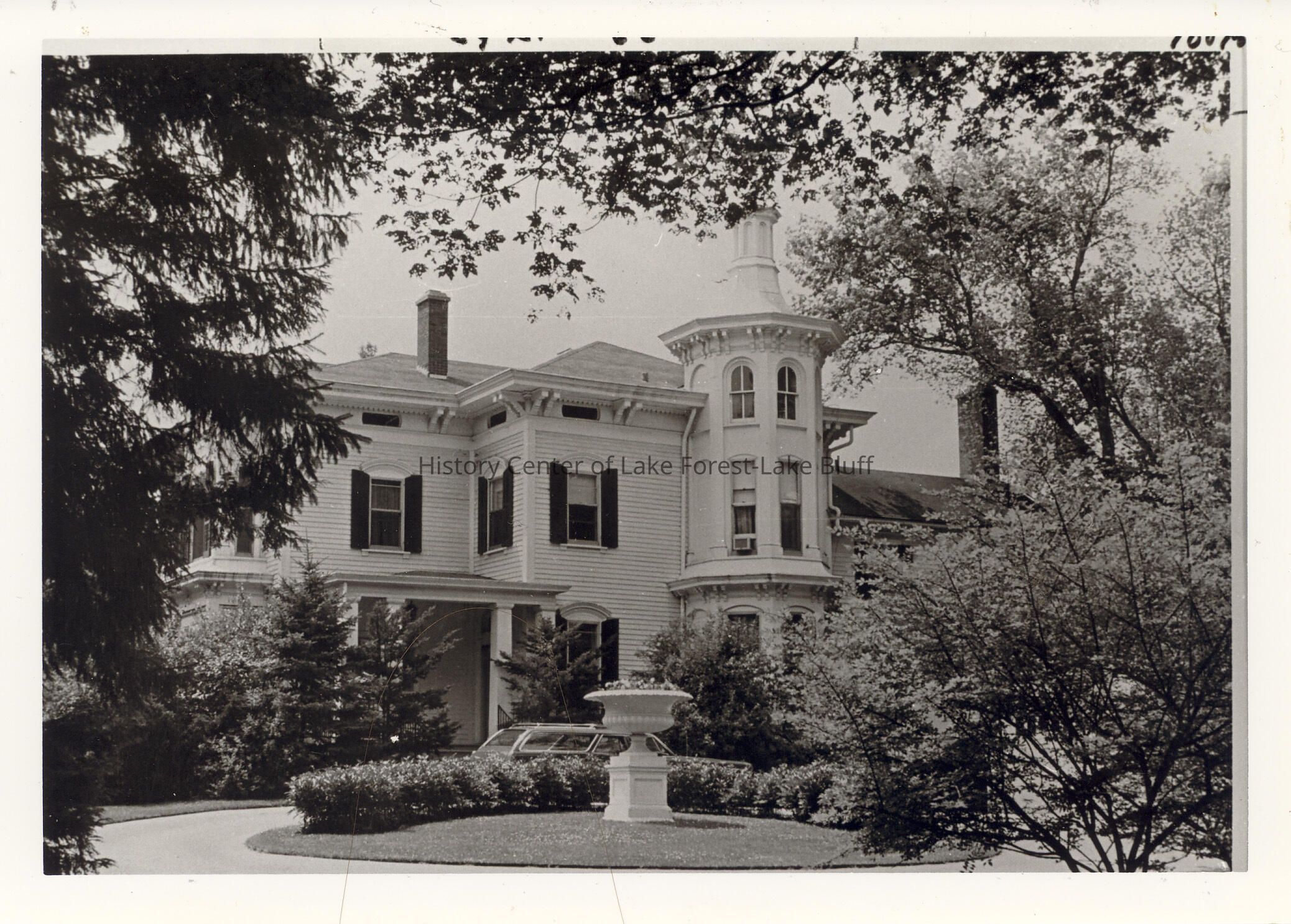 Two-story Victorian and Italianate structure of frame/clapboard construction.There is a three-story octagonal tower to the right of the main entrance topped by a spindle with a pointed spire. Topmost windows in the tower are arched. There is a circular drive with an iron planter in the center.