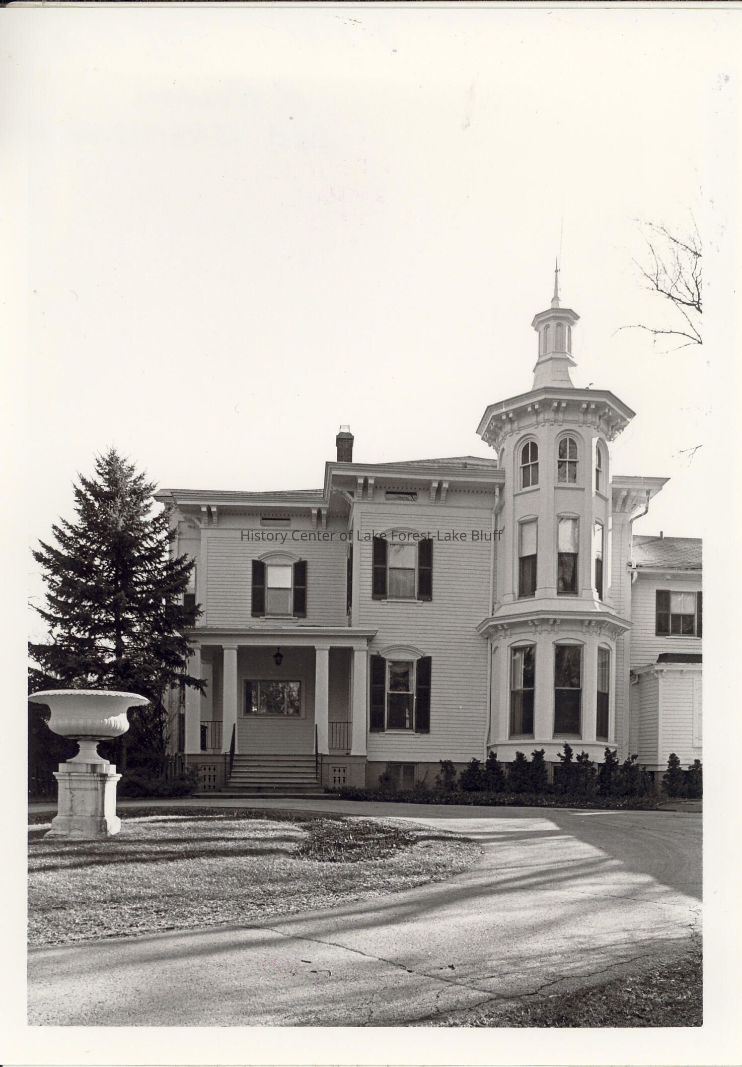 Two-story Victorian and Italianate structure of frame/clapboard construction.There is a three-story octagonal tower to the right of the main entrance topped by a spindle with a pointed spire. Topmost windows in the tower are arched. There is a pillared front porch and a planter in the center of a circular drive.