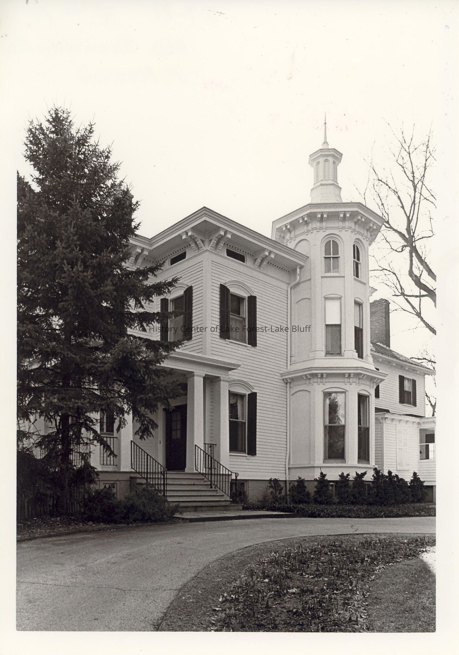Two-story Victorian and Italianate structure of frame/clapboard construction.There is a three-story octagonal tower to the right of the main entrance topped by a spindle with a pointed spire. Topmost windows in the tower are arched. There is a pillared front porch and cornices with paired brackets.