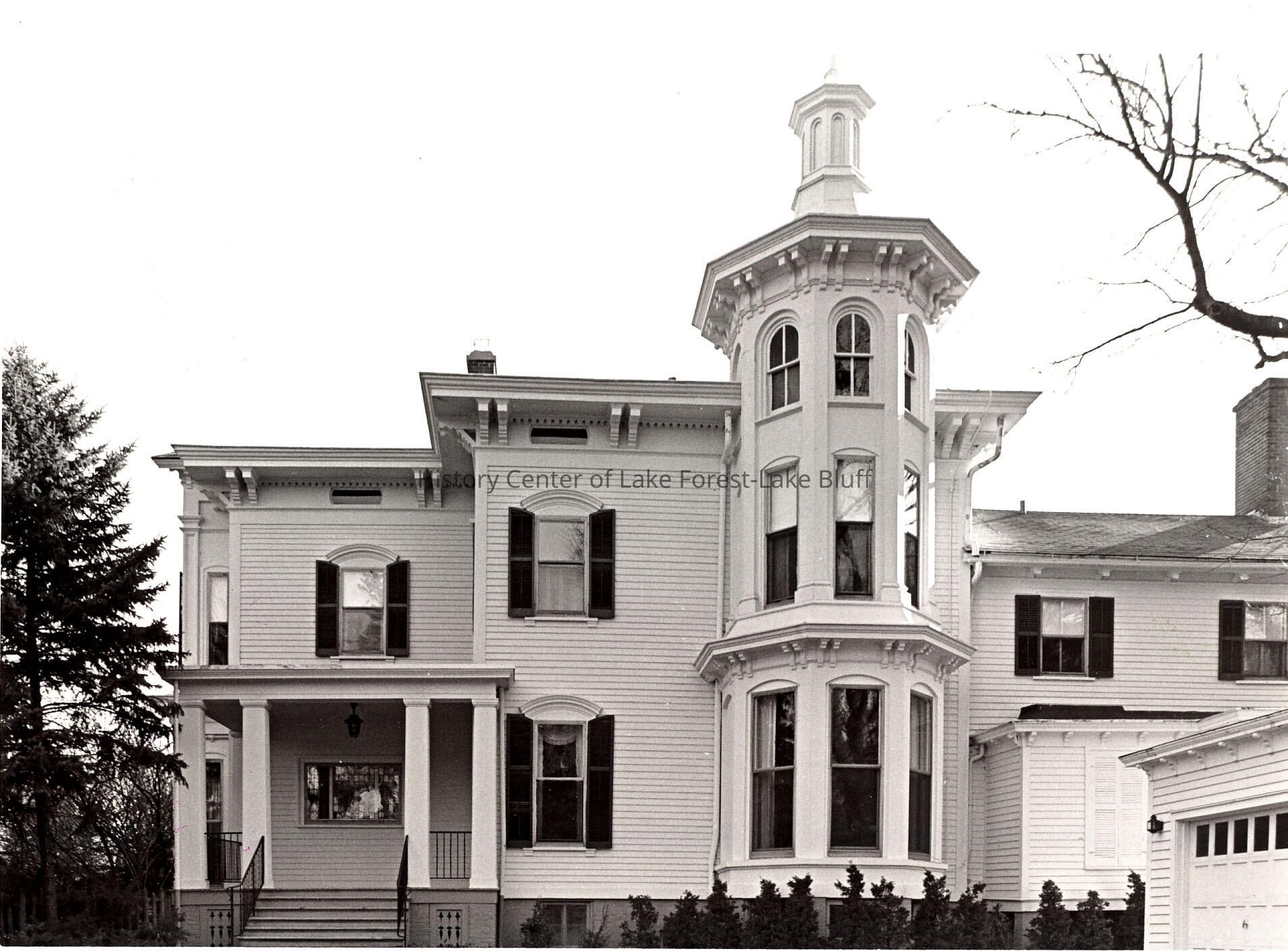 Two-story Victorian and Italianate structure of frame/clapboard construction.There is a three-story octagonal tower to the right of the main entrance topped by a spindle with a pointed spire.Topmost windows in the tower are arched. There is a pillared front porch and a detached garage in the foreground.
