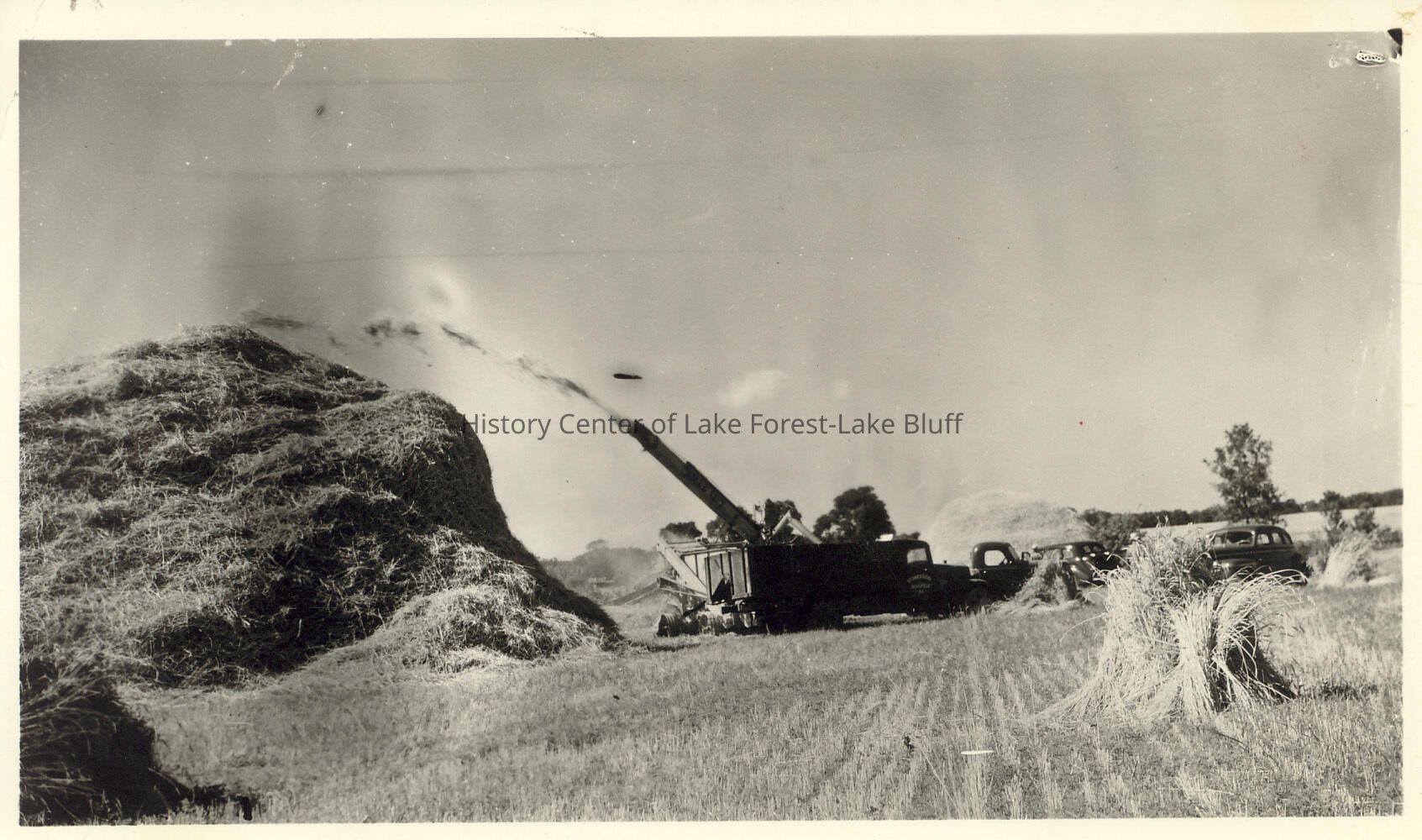 Machine breaking up the hay and launching it into a large pile. Hay harvesting. Sneddon collection - Everett Stock Farm, Westleigh Farm or Lancaster farm.