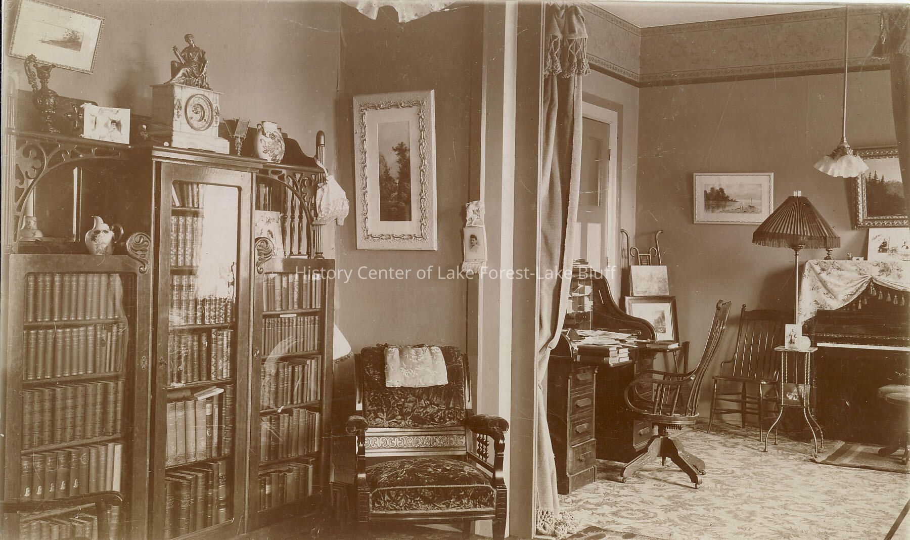 Sepia toned 5.25" x 7.25" interior view of the head master's rooms at Remsen Cottage at Lake Forest Academy. may have been on Poplar Avenue, Lake Forest