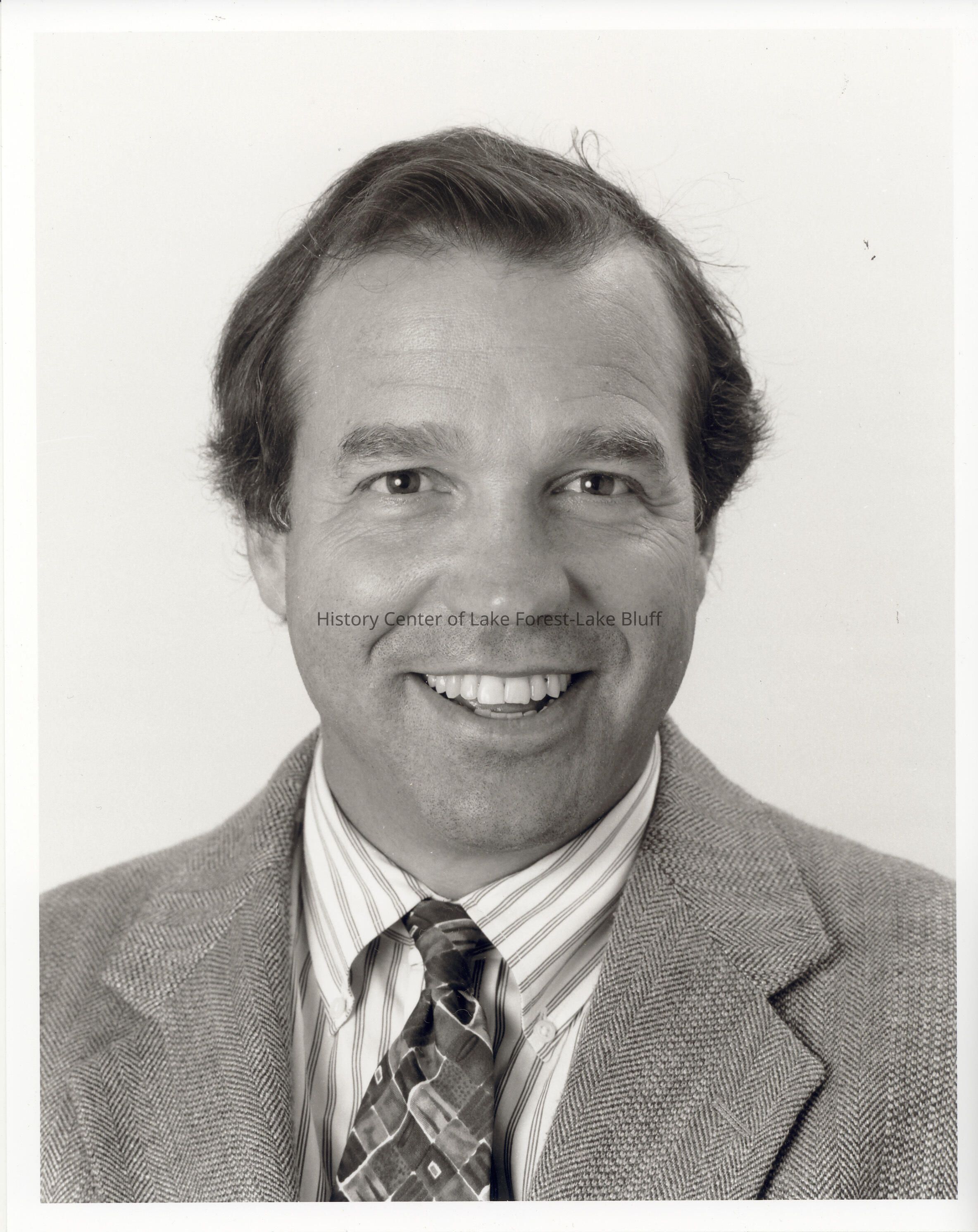 Headshot of unkown, smiling, middle-aged man in suit.