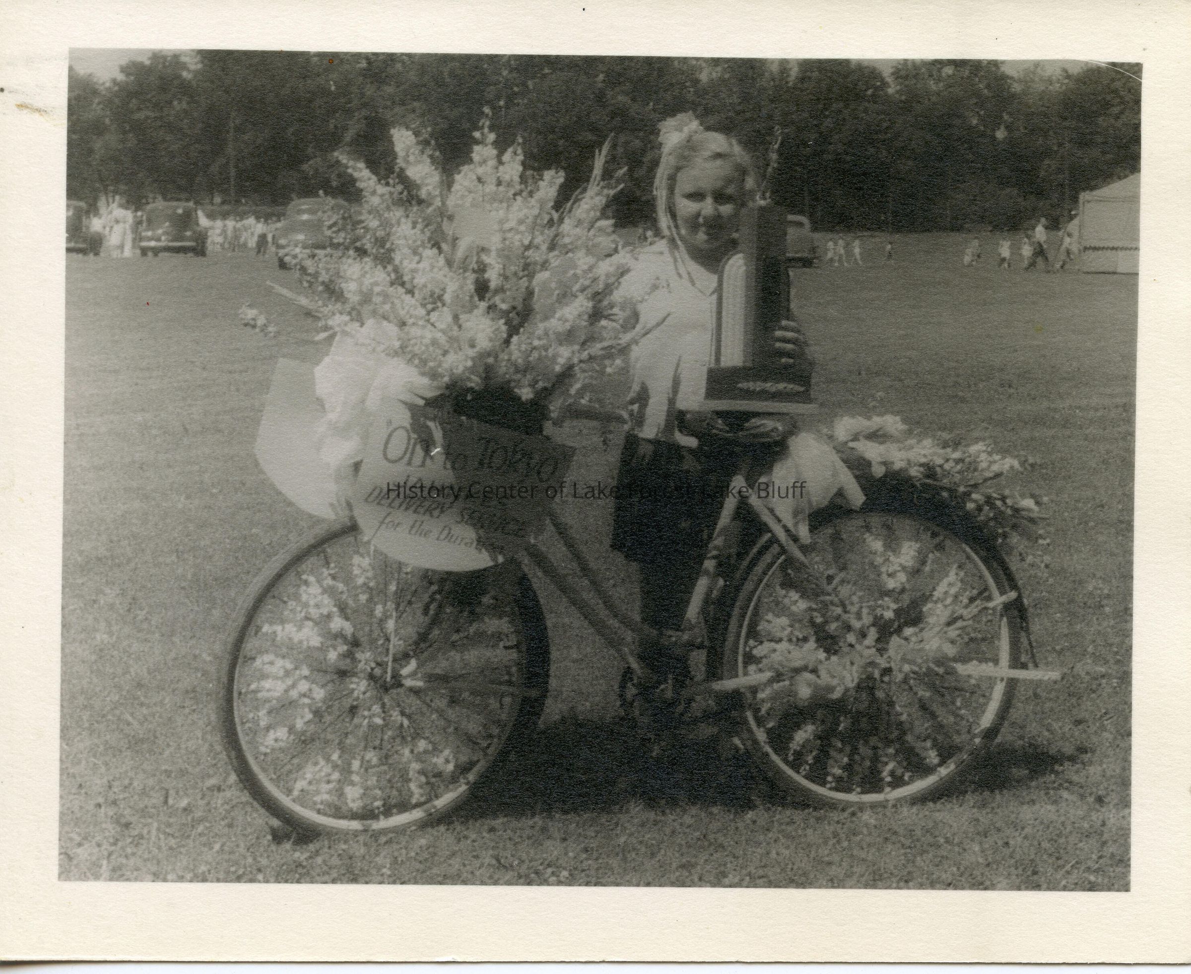 Lake Forest Day: 100 Years of Celebration, p. 53. Helen Jahnke with bicycle decorated with flowers from her father's shop, Herman R. Jahnke Florist.