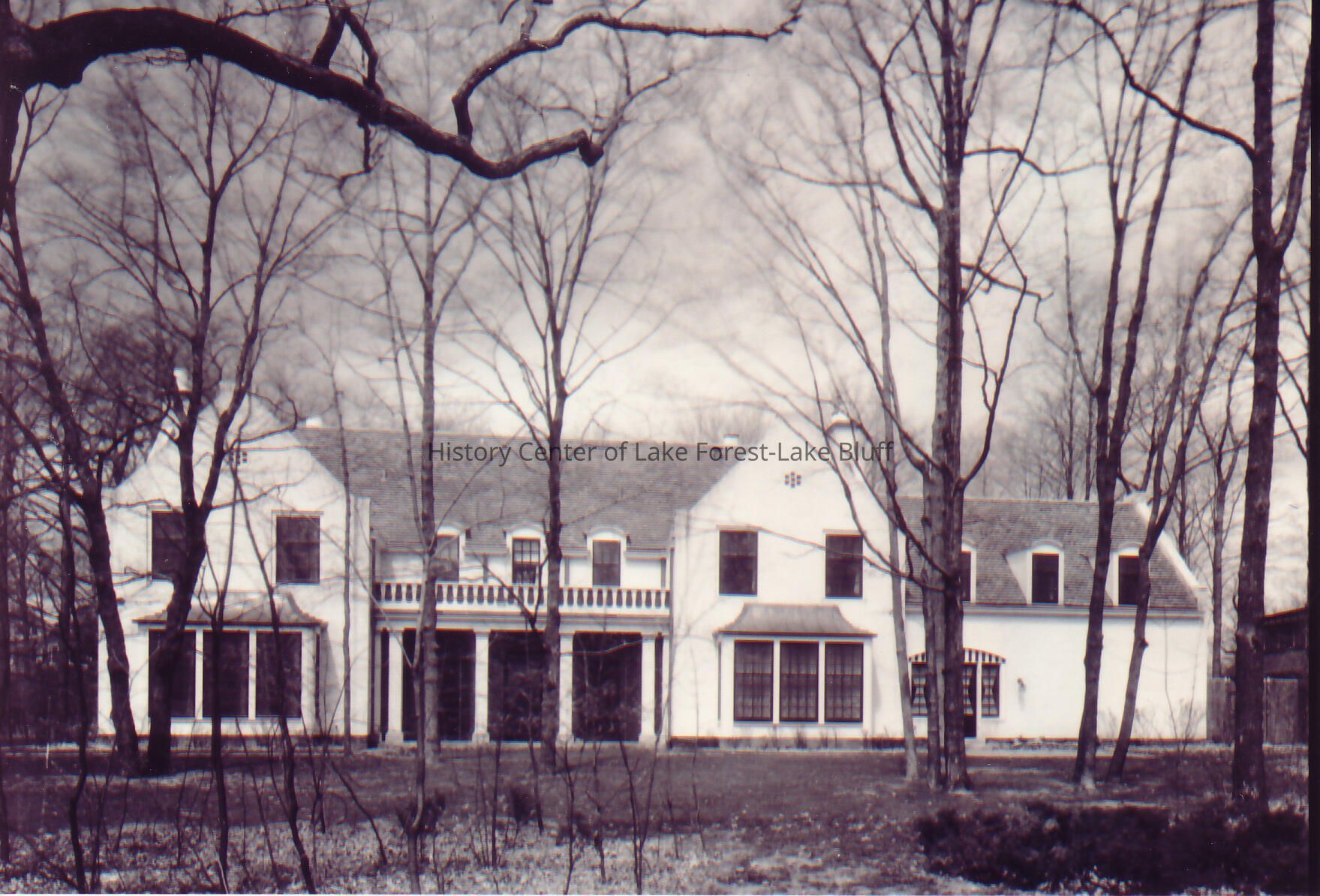 Rear exterior view of Walter Frazier home built for Henry and Dorothy Rowley in 1930. Located at 581 E. Crab Tree Lane in Lake Forest, Illinois. (Black and White Image)
