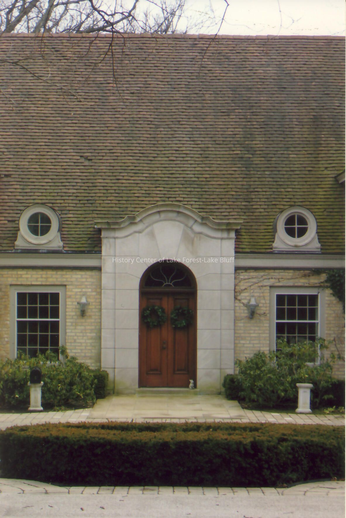 Close up exterior view of Walter Frazier home built for Henry and Dorothy Rowley in 1930. Located at 581 E. Crab Tree Lane in Lake Forest, Illinois.
