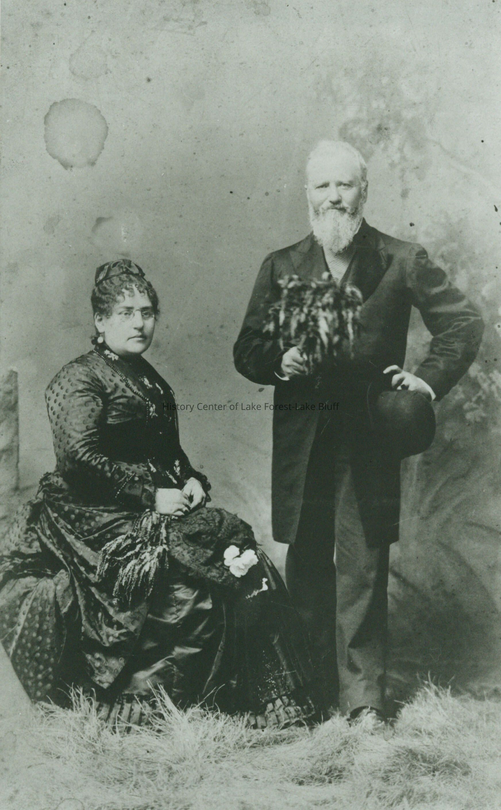 Black and white sepia toned photograph of Henry C. and Annie W. Durand. Henry is standing while Annie is seated. They are posed in a stuido with a naturalistic background. Hay is strewn about the ground to give the illusion that they are outside. Henry is holding a bouquet of flowers.
