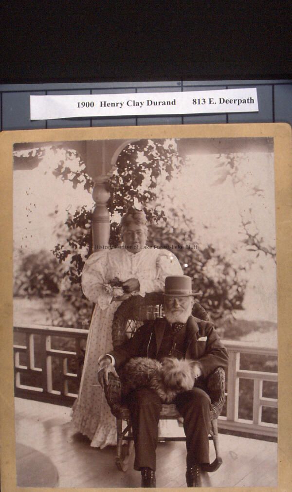 Black and white sepia toned photograph of Henry C. and Annie W. Durand. Henry outside on a porch. Henry is seated in a wicker rocking chair holding a dog and Annie is standing behind him. Photograph is mounted on ivory card board. Same image as: 2002.287.17