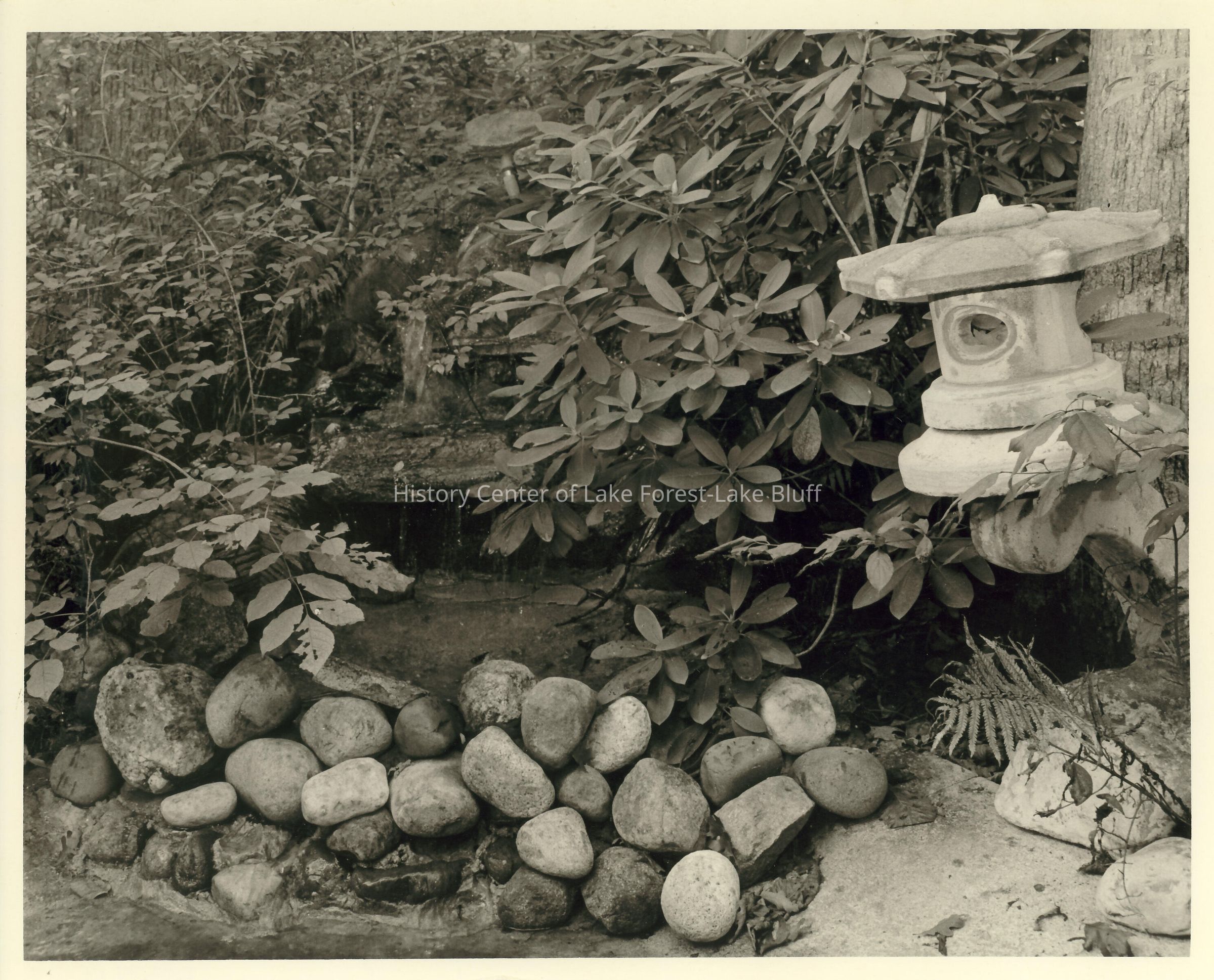outdoor Japanese lantern sculpture and fountain waterfall in one corner of the garden.
