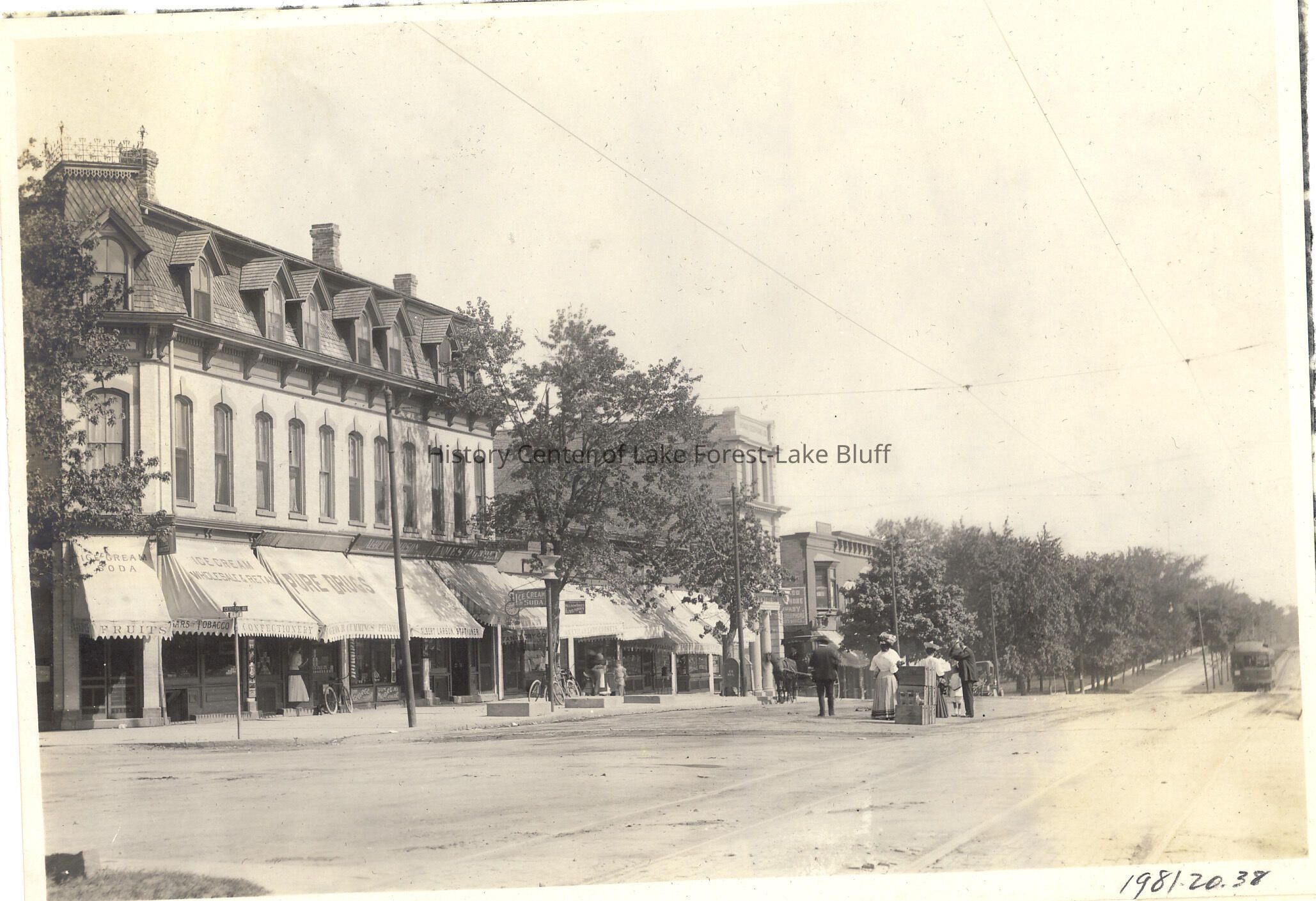 Highland Park looking south on St. Johns Avenue from Central Street. Tall narrow south building built by Illinois Bell Telephone. trolley car