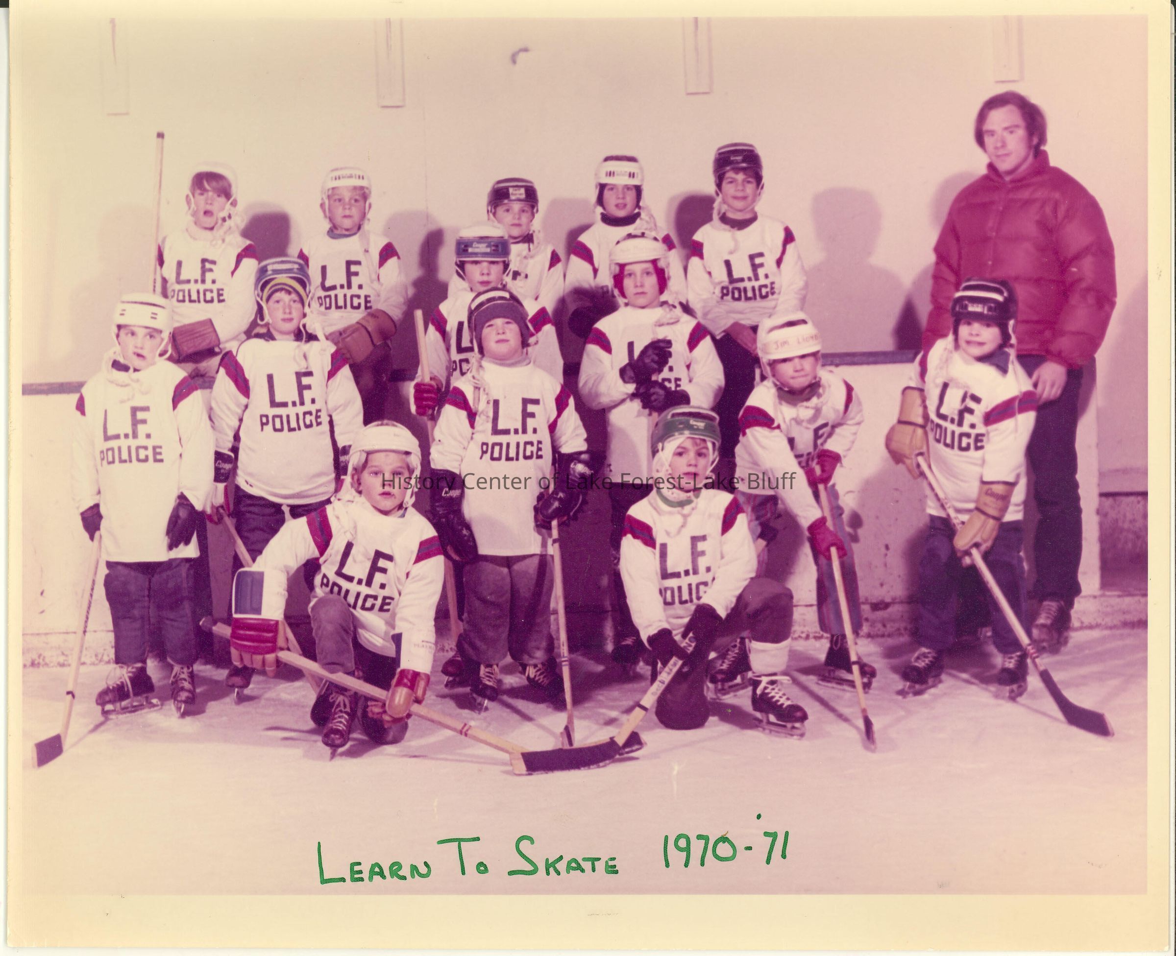 boys hockey team; sponsored by the LF Police; uniforms are white and red with LF police imprinted on the front. Learn to Skate 1970-71