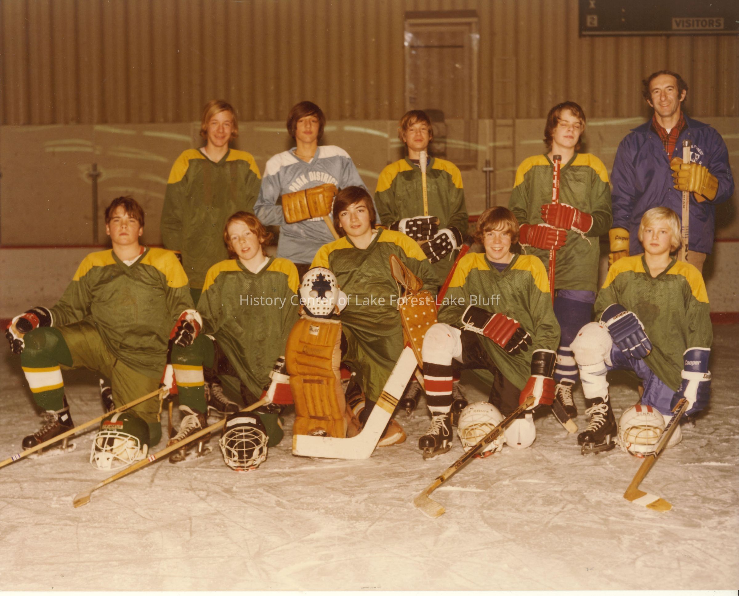 Boys hockey team, nine players and one coach; uniforms are gold and green, the boys appear to be teens from 12-15yrs of age