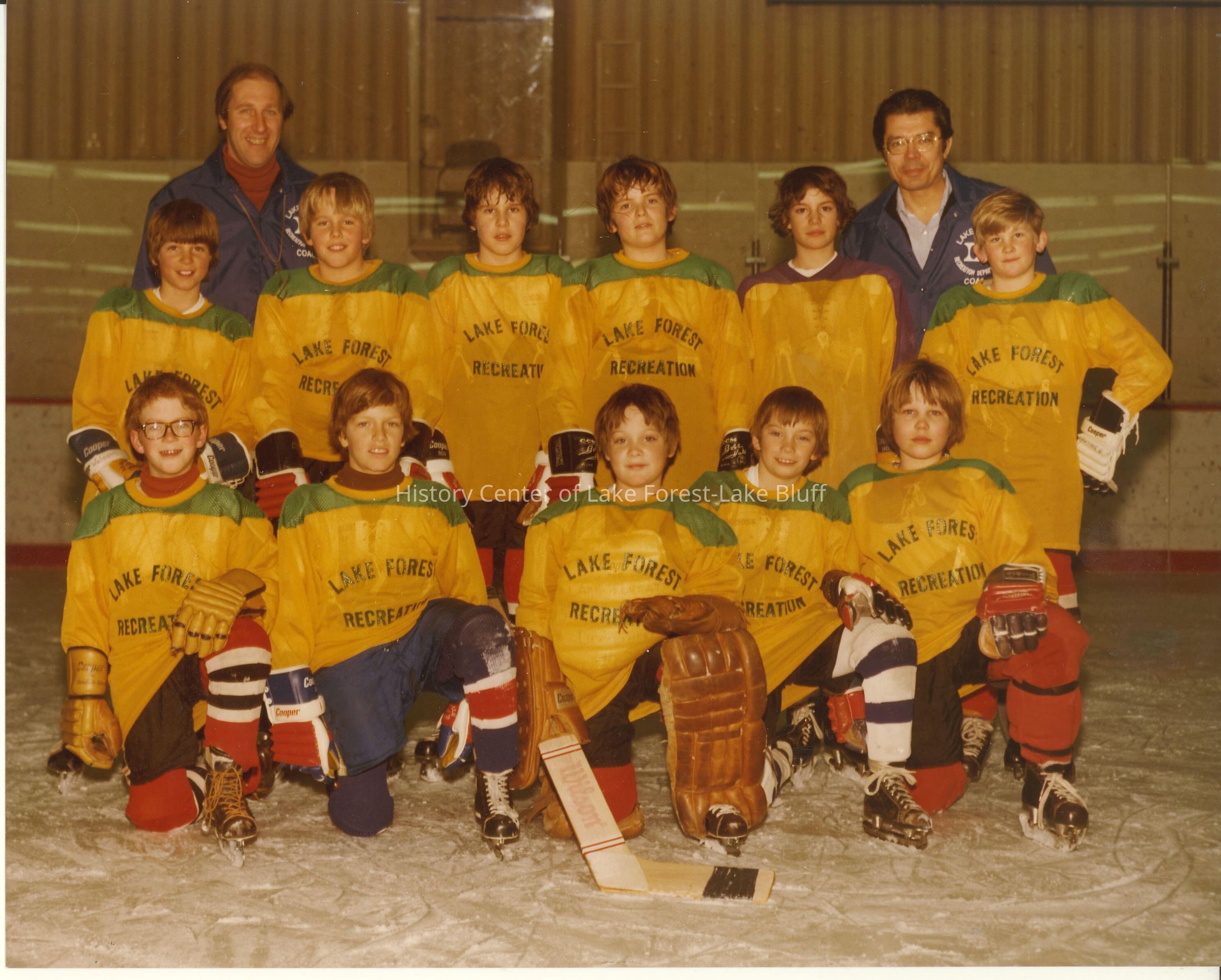 Boys hockey team, eleven players and 2 coaches; uniforms are gold and green; boys seem to 7-11 yr olds