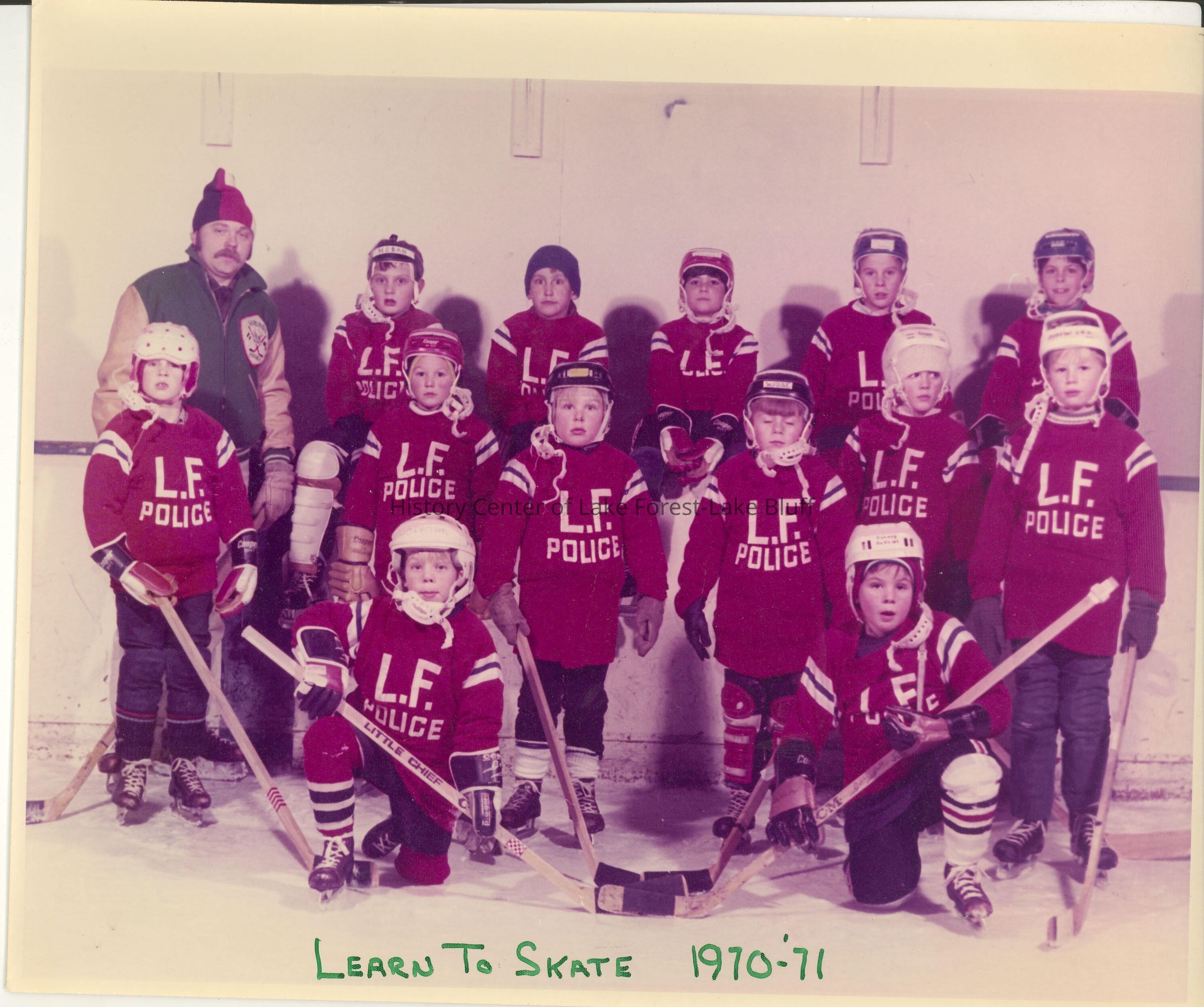 Team Photo of "Learn to Skate" 1970-1971. Thirteen players, one coach. Sponsored by the LF Police Dept. Uniforms are red and black.