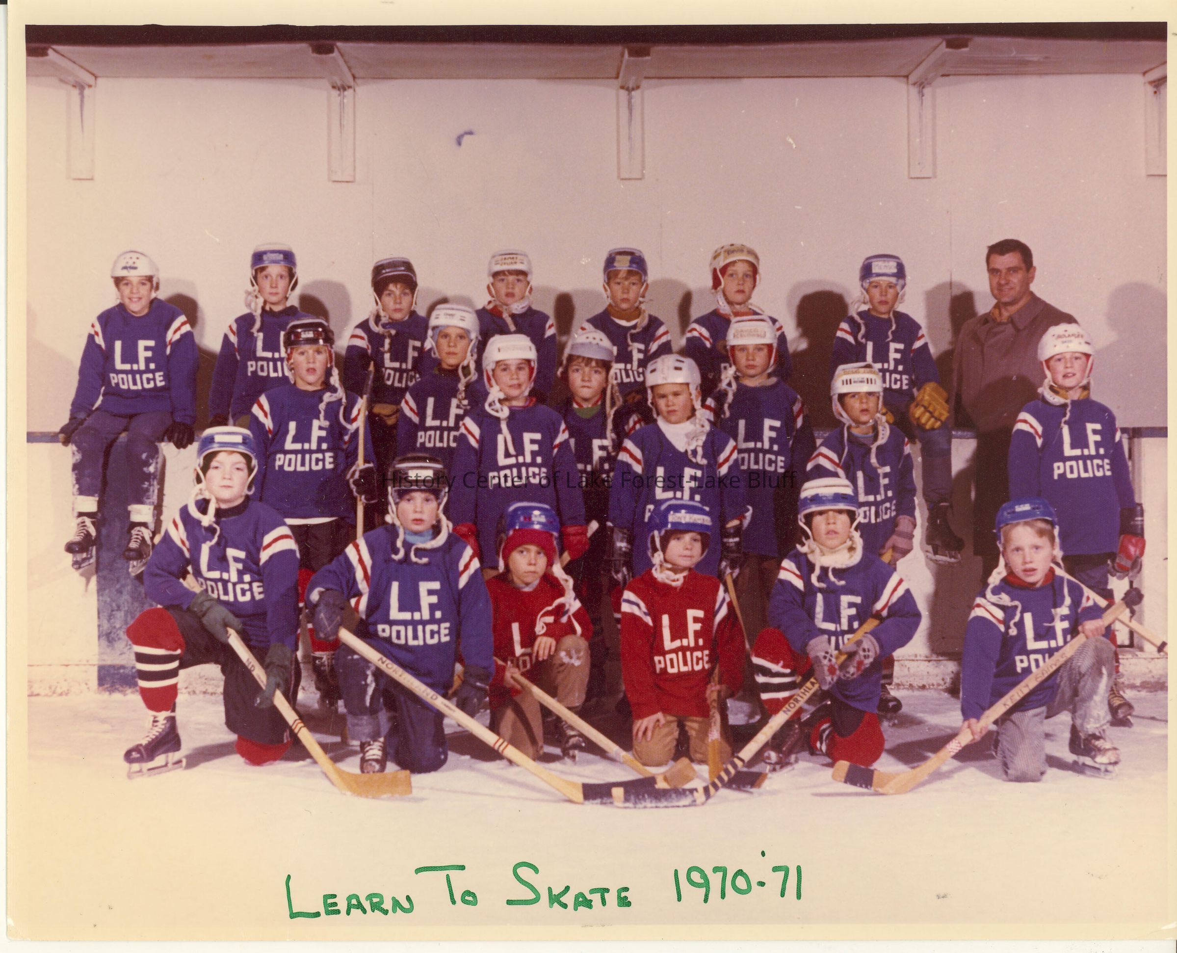 Team photo of 'Learn To Skate" 1970-1971. Uniforms are blue shirts, red pants. Twenty one players and one coach, spondored by LF police dept.
