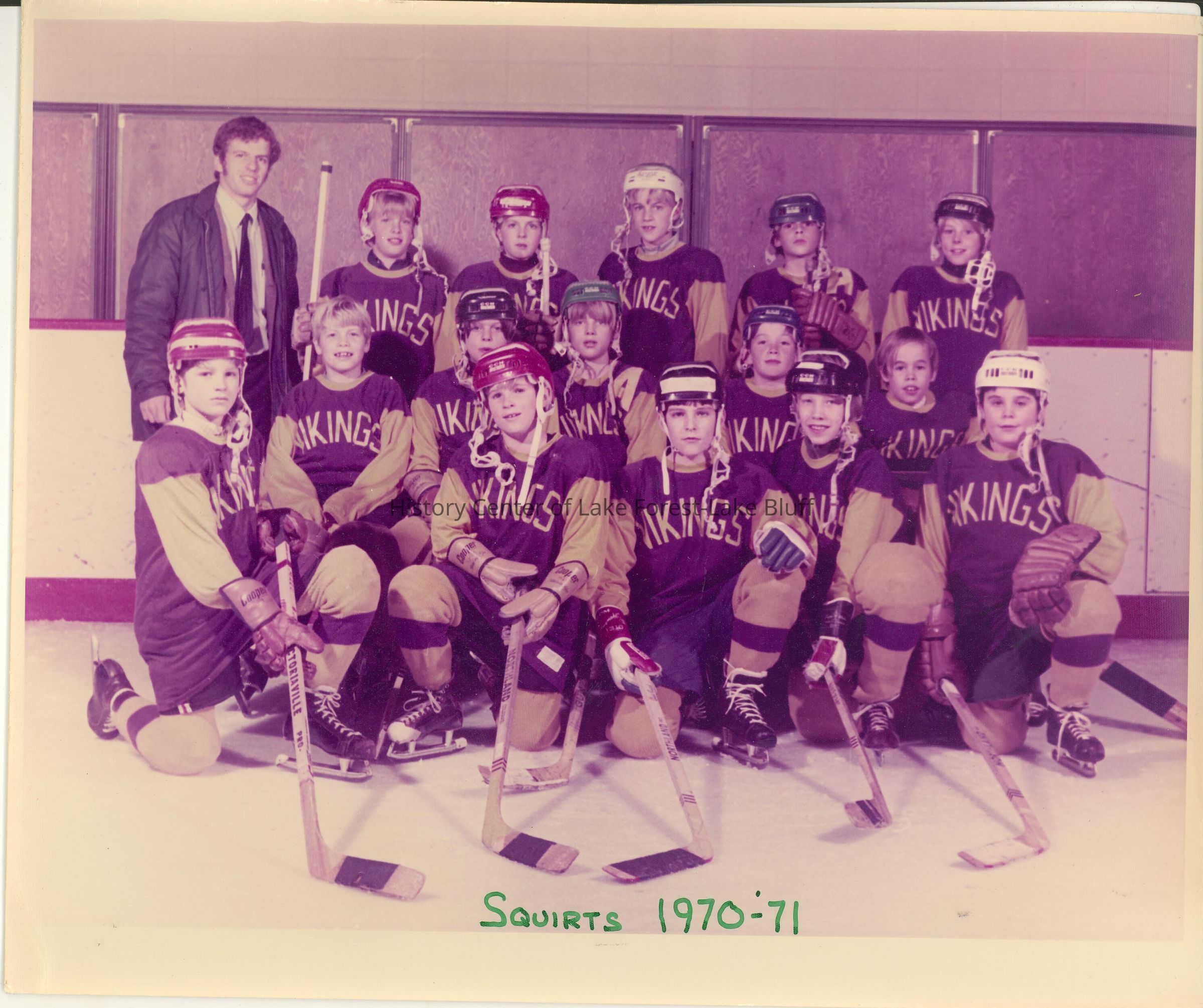 Team photo of the "Squirts" 1970-1971. Name on uniform is Vikings. Fifteen players and one coach.