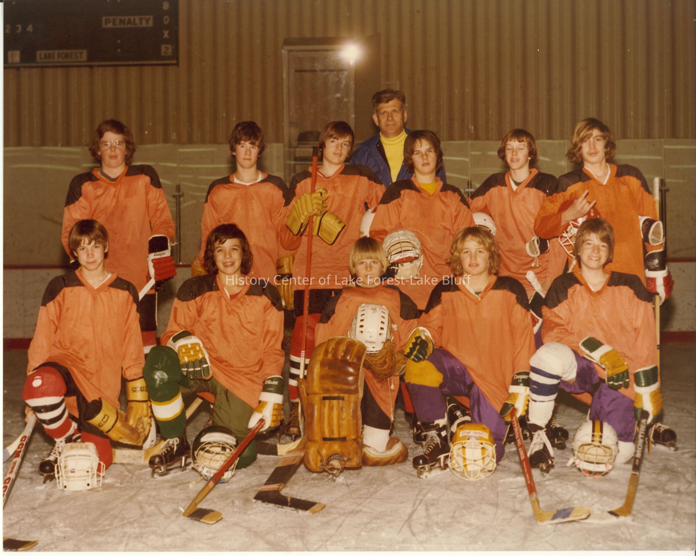 Boys hockey team 12 players, 1 coach; univforms are orange and brown or black