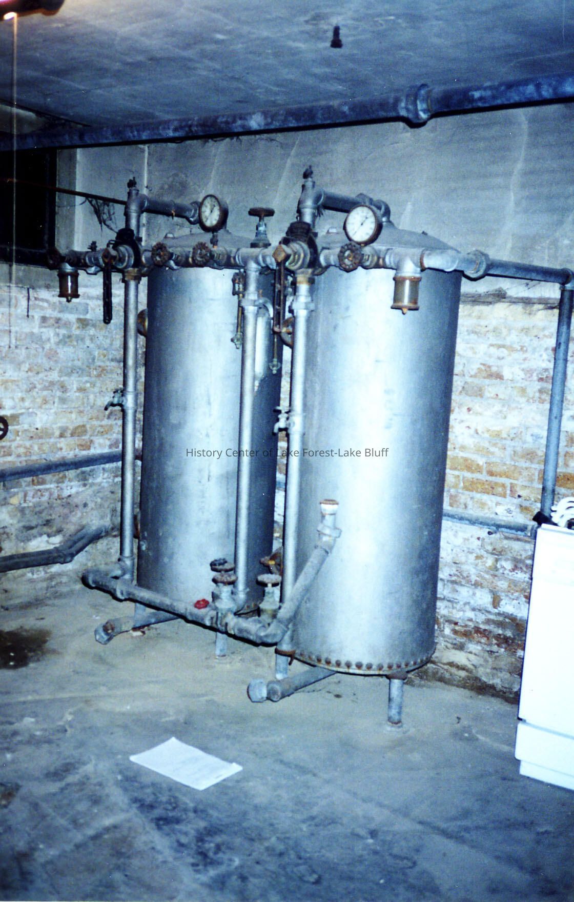 A fire suppression system in the basement of "Argyllshire," consisting of two holding tanks with hoses to the third floor