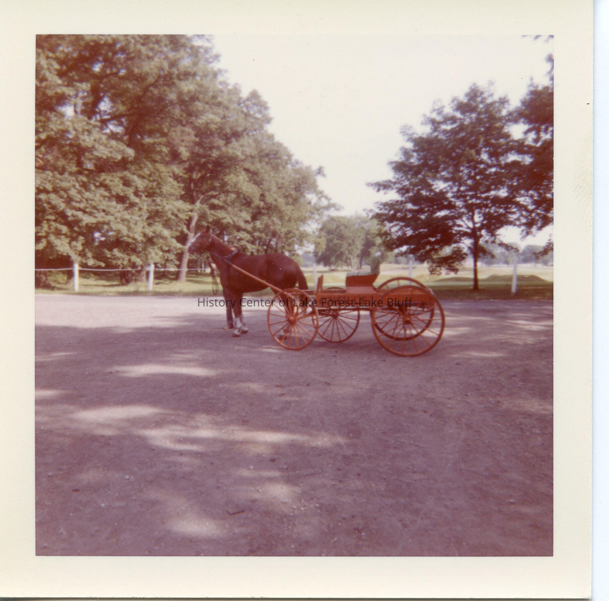 Kodacolor print dated July 1961. Horse with red delivery wagon. The word O'Neill's is visible on the side of the wagon. Lake Forest Day: 100 Years of Celebration, p. 101.
