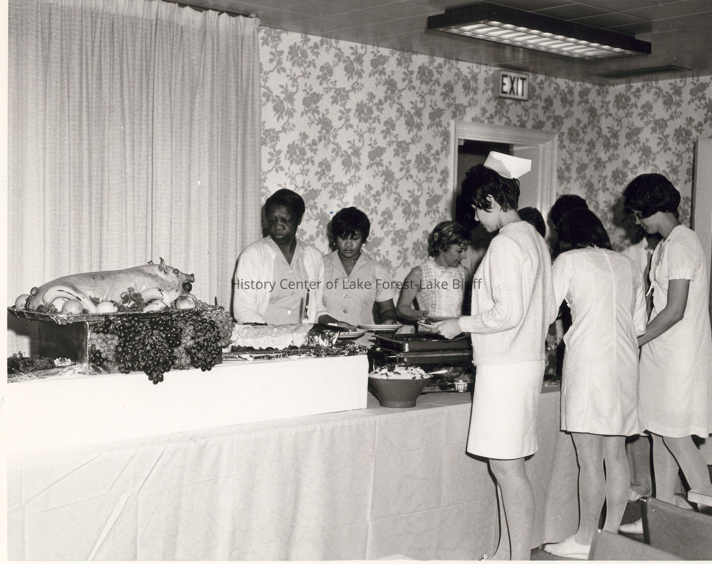 Hospital Employees go through buffet line for hospital employee apprerciation luncheon. The name "Agnes Blanchard" is written on the back of the photo. Photographs relating to Lake Forest Hospital collected for the 100th Anniversary of the Hospital by the Development Department.