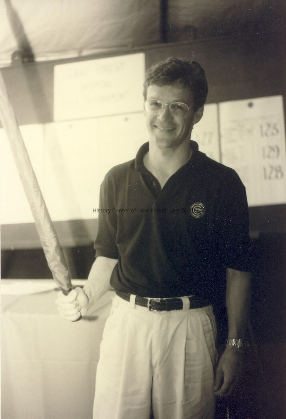 Photo of man holding what appears to be an umbrella. there are sheets of paper with scores on them in the background. Photographs relating to Lake Forest Hospital collected for the 100th Anniversary of the Hospital by the Development Department.