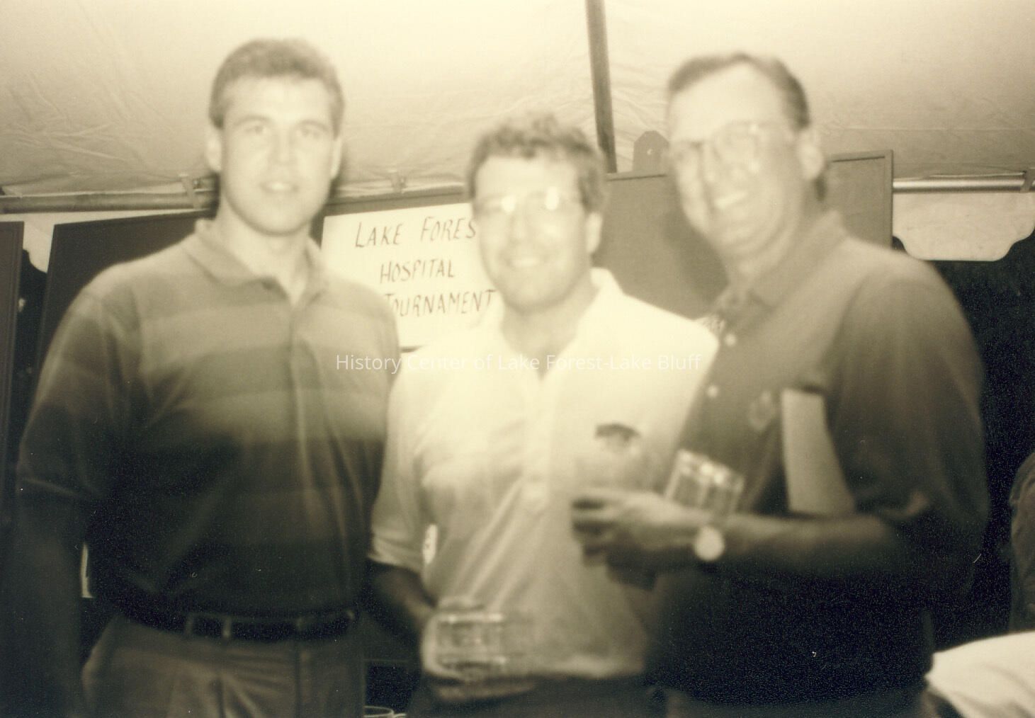 Photo of three men holding glass pitchers. They are outside under a tent with a sign behind them that reads: "Lake Forest Hospital Tournament. (It appears to be a golf tournament).