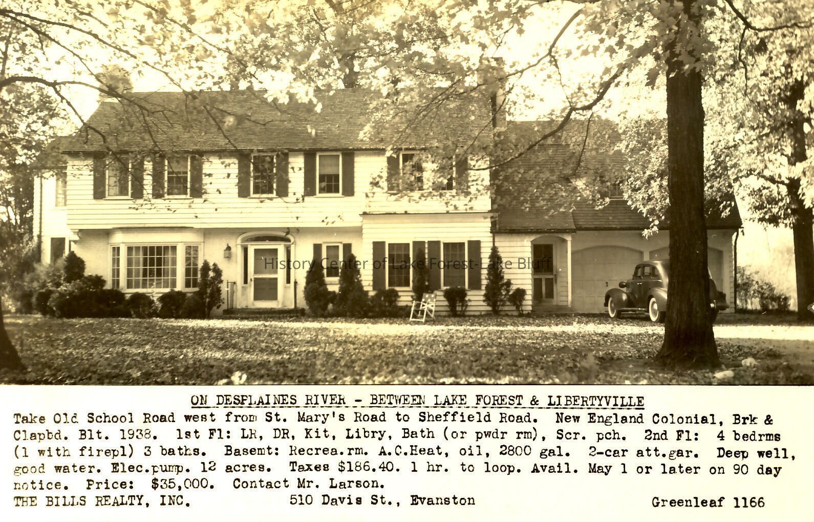 New England Colonial house on Desplaines River, between Lake Forest and Libertyville reality listing on a postcard