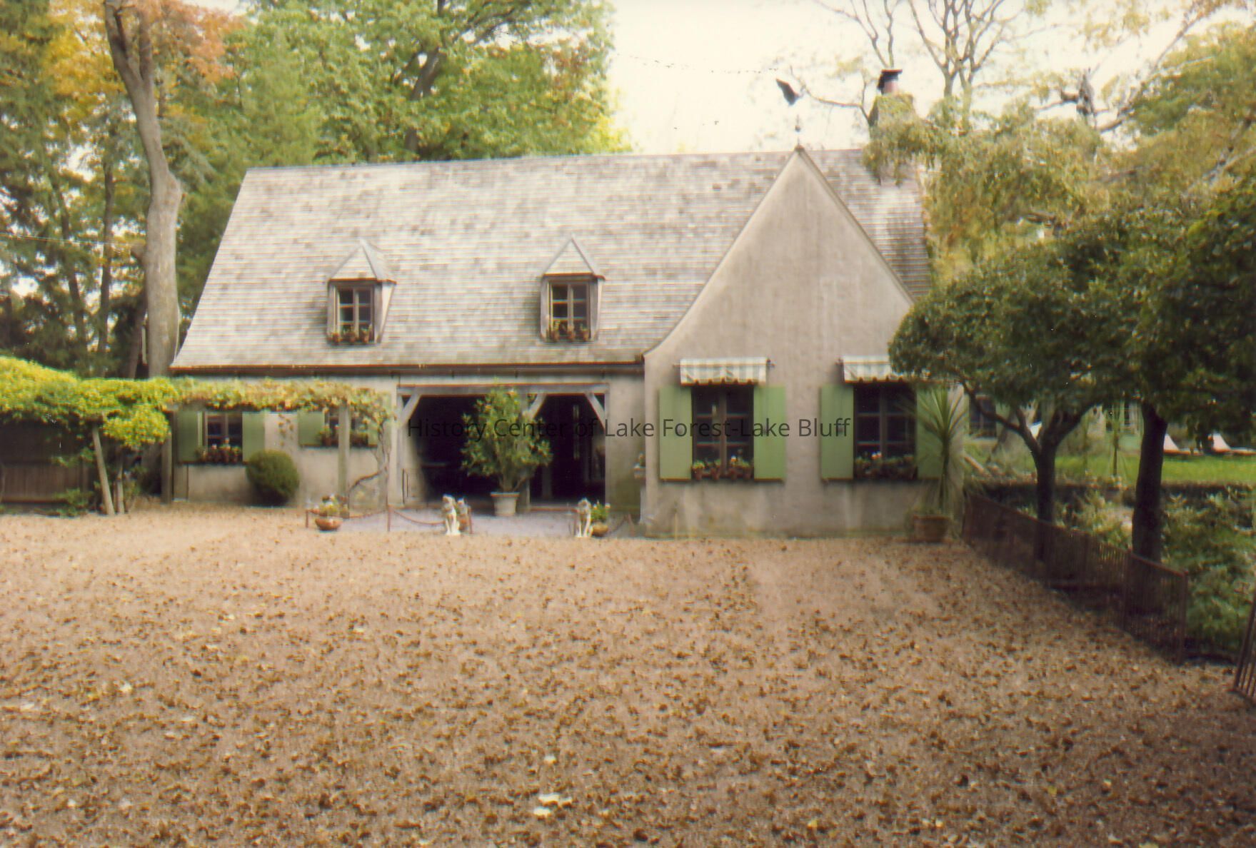 Exterior view from drive way of Walter Frazier home built for Howard and Lucy Linn in 1925. Located at 555 Shore Acres Road in Lake Bluff, Illinois.