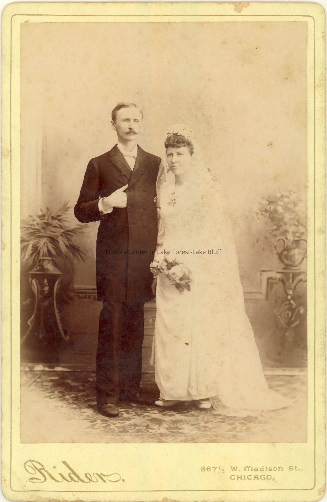 Ida Evans and husband Hiram A. Haines in wedding clothes. On back, "this wedding picture was made a year or so before my mother and father came to live in Lake Bluff in the summers." They were married June 18, 1891 in Knox County, IL.