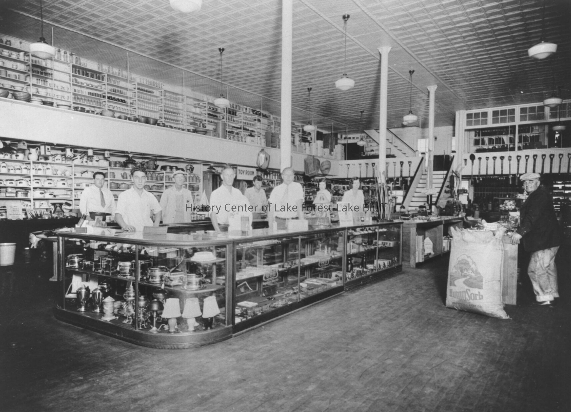 Black and white photograph of the interior of O'Neill's Hardware, 256 East Westminster. The employees are standing behind the counters.
