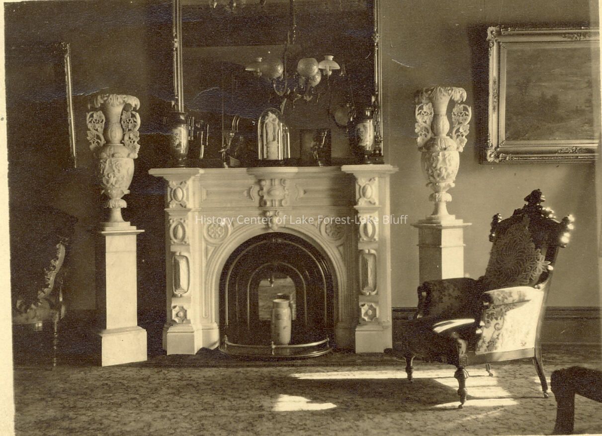 Photo of a fireplace with two urns on either side Harvey home in Lake Bluff ?