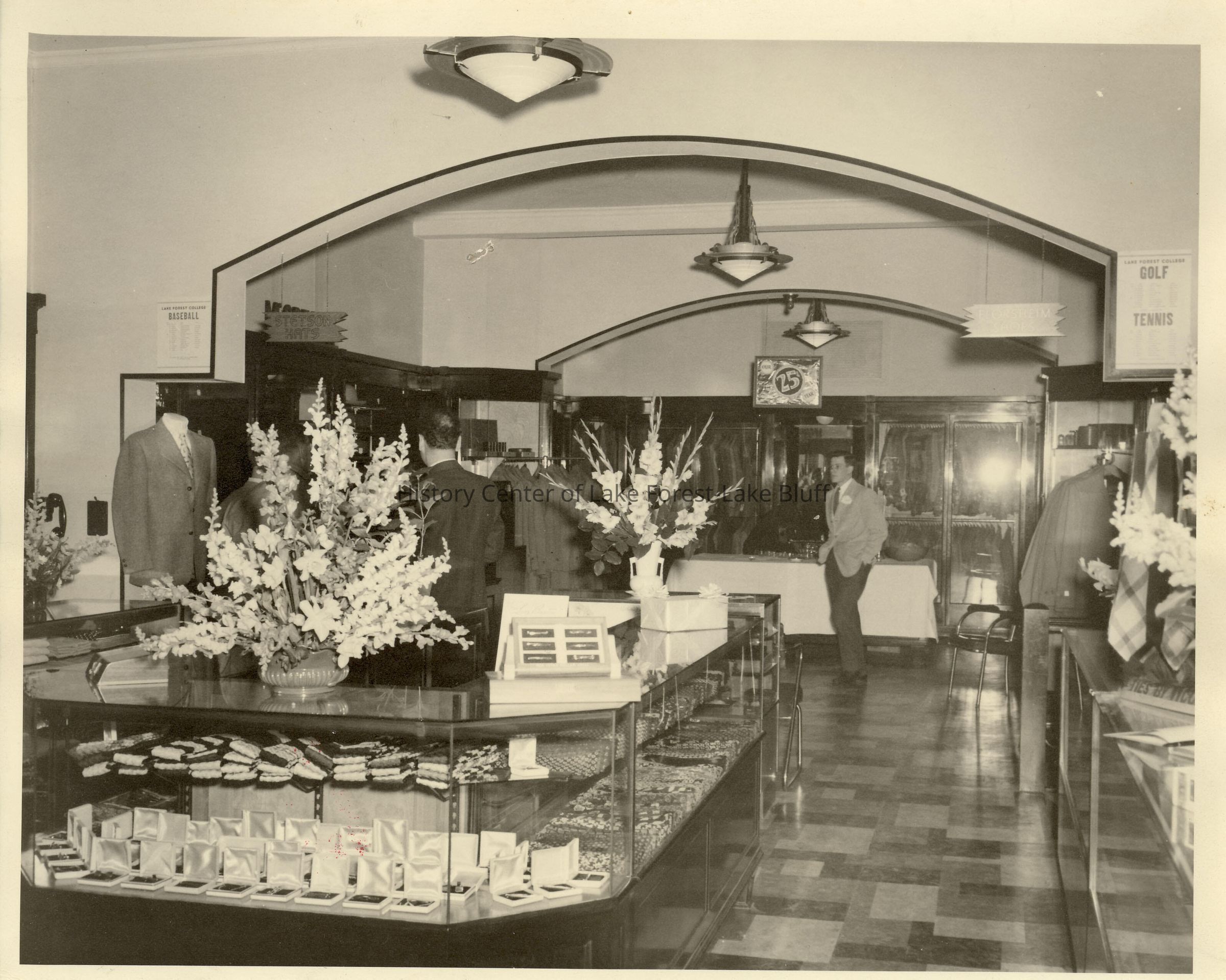 Interior view of Robertson's Men's Clothing Store. Photo was taken slightly to one side of the tie counter. There are two men visible in the photo: one behind the counter with his back to the camera, the other facing the camera and standing near a table. Above the table is a sign saying that the store, founded in 1922, is celebrating its 25th year. This image shows the 276 E. Deerpath location, where Robertson's was located from 1932-1952.