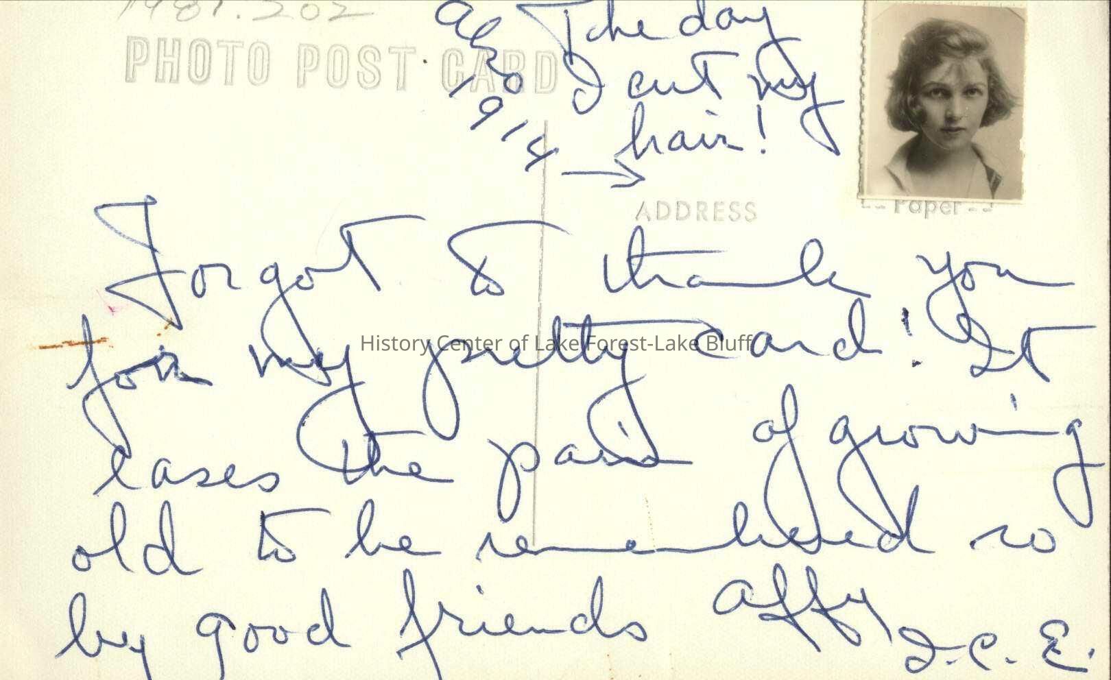 Black and white negative and postcard which measures 5 5/8" x 3 1/2". The stamp on the card is a mini photograph of Irene in 1914, the day she cut her hair, and is signed by Irene. Card says, "Forgot to thank you for my pretty card. It eases the pain of growing old to be remembered so by good friends." Affy I.C.E. 1914