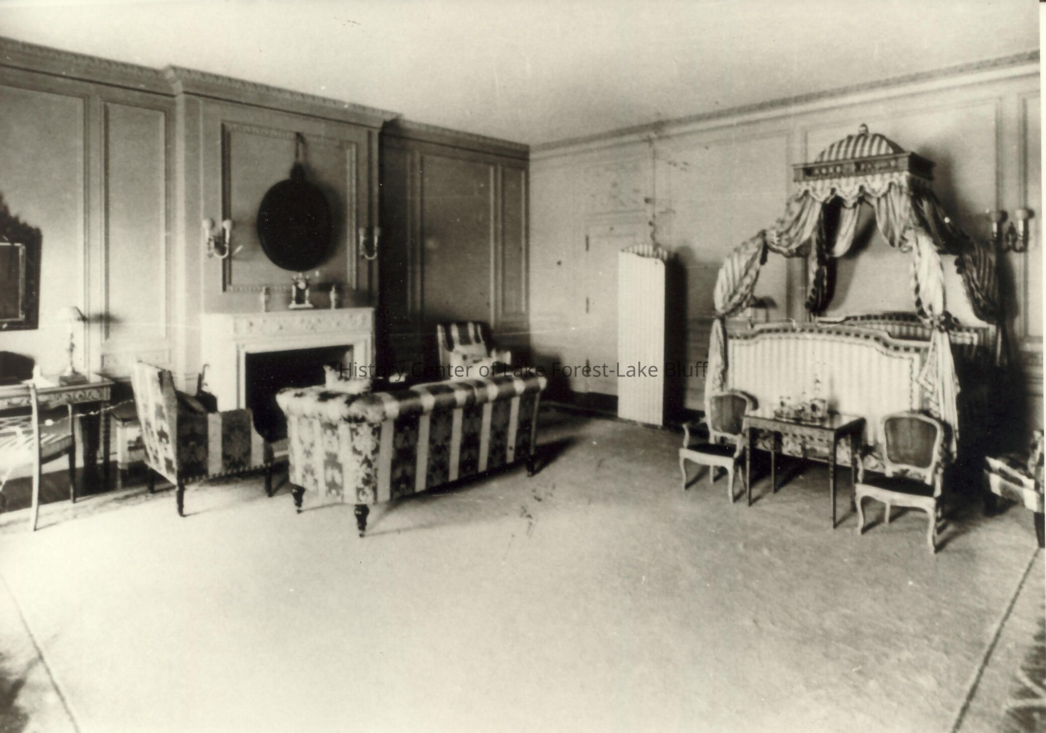 J. Ogden Armour Estate - "Mellody Farms" Bedroom bed to the right, couch and fireplace to the left