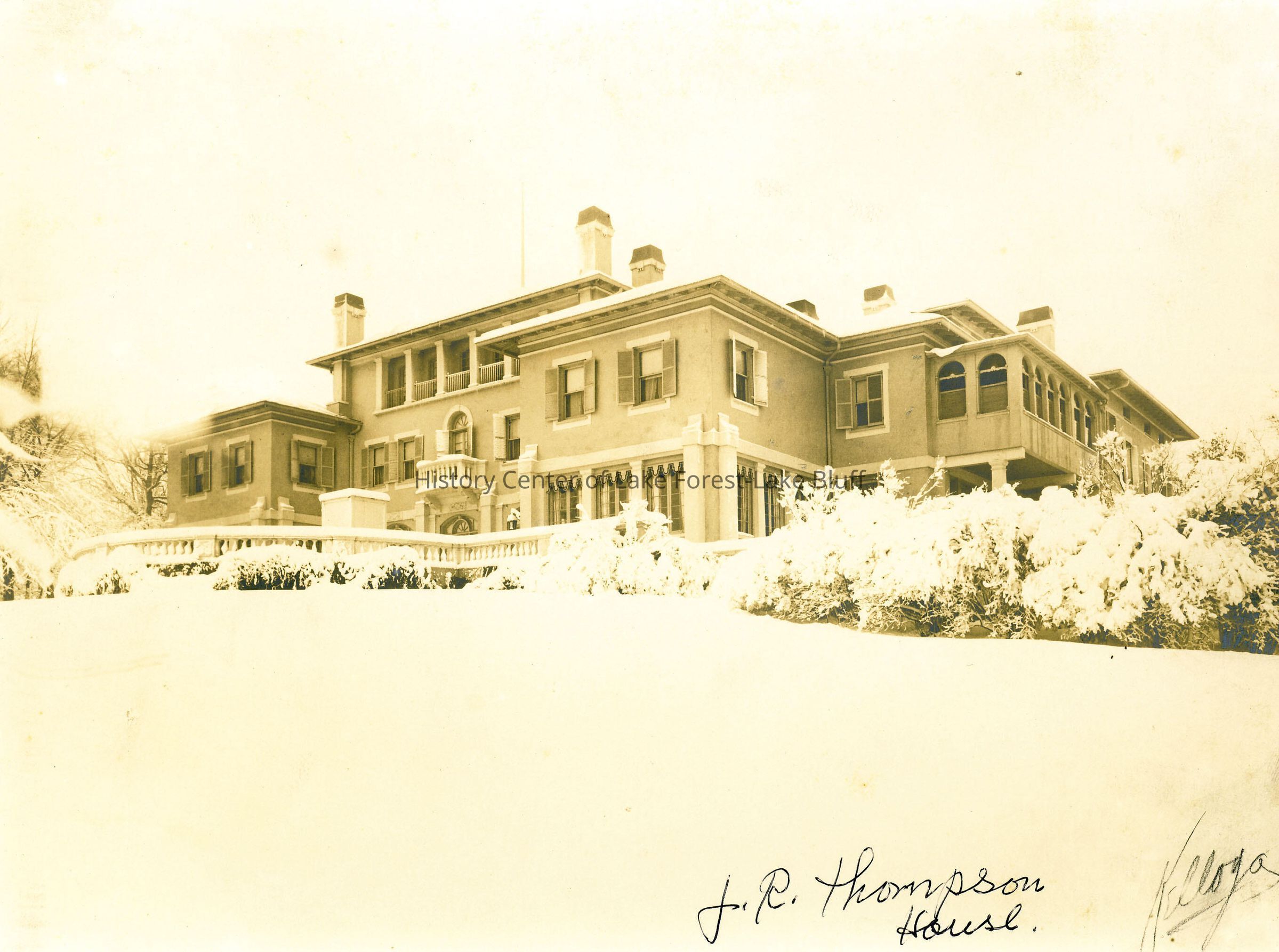 Sepia toned photograph of the house exterior, probably the garden facade, of the John R. Thompson House, circa 1930s. (razed ca. 1969) in winter