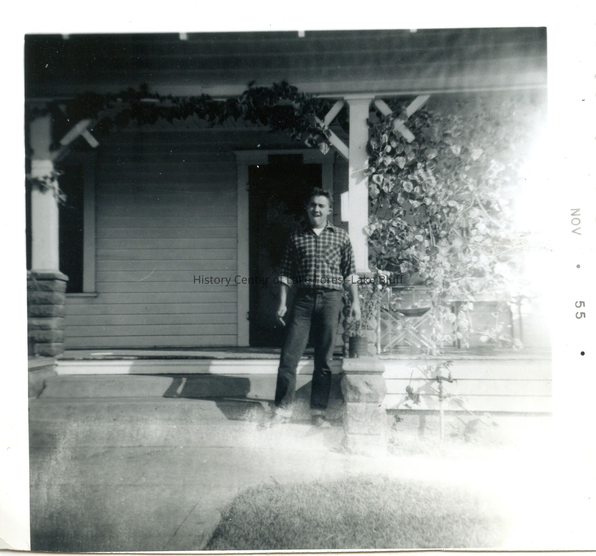 Jack Steele in front of house with trellis. Black and white. Note on back: "Jack making a face as usual. I still hope to get some nicer pictures." November 20, 1955.