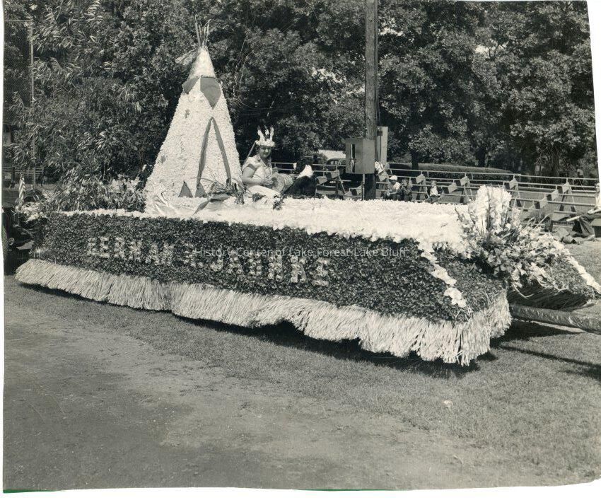 Herman R. Jahnke Lake Forest Day float, 1947. Helen Jahnke on float with teepee. Lake Forest Day: 100 Years of Celebration, p. 57.