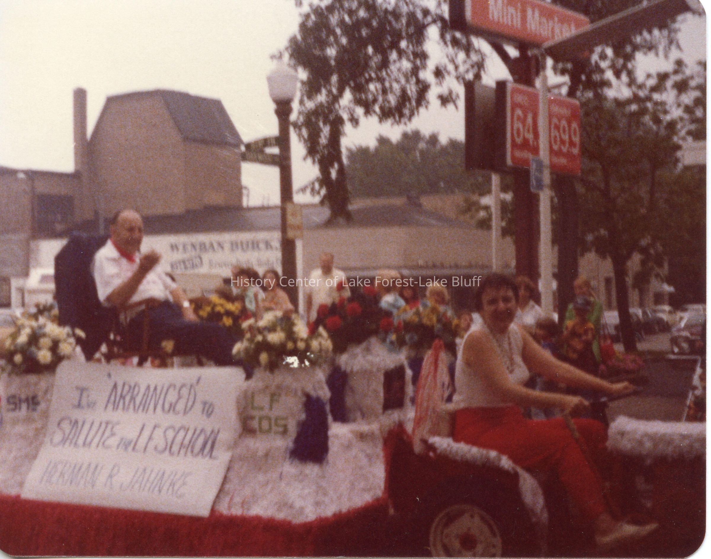 Herman R. Jahnke Lake Forest Day float circa 1963-1973. Sign on float reads "I've arranged to salute the LF School."