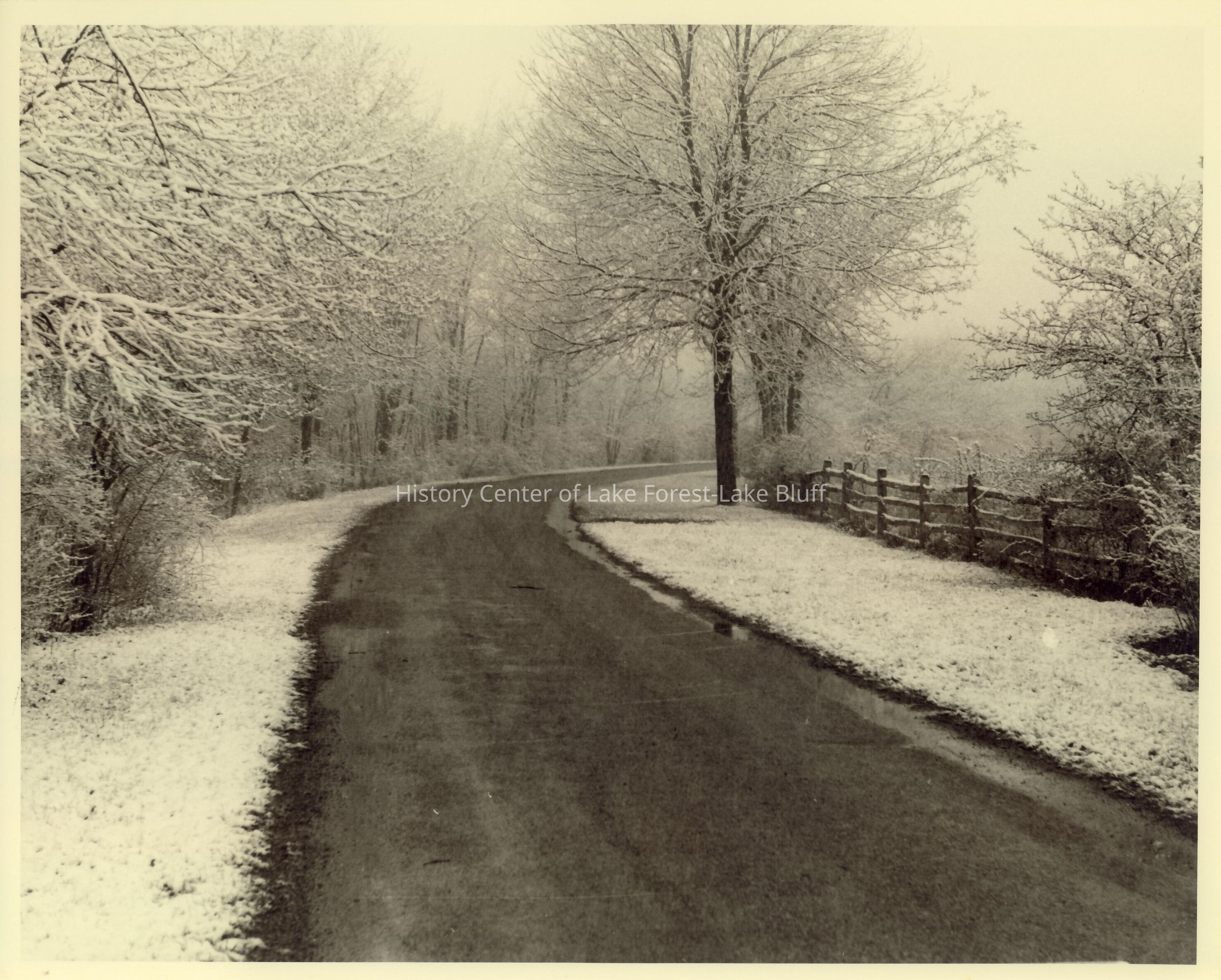 Photo of drive way leading up to Walter Frazier home built for James and Betsy Getz in 1939. Located at 850 Riverwoods Road in Mettawa, Illinois. (Black and White Image)