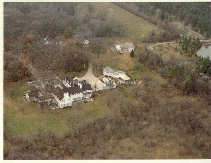 Aerial view of Walter Frazier home built for James and Betsy Getz in 1939. Located at 850 Riverwoods Road in Mettawa, Illinois.