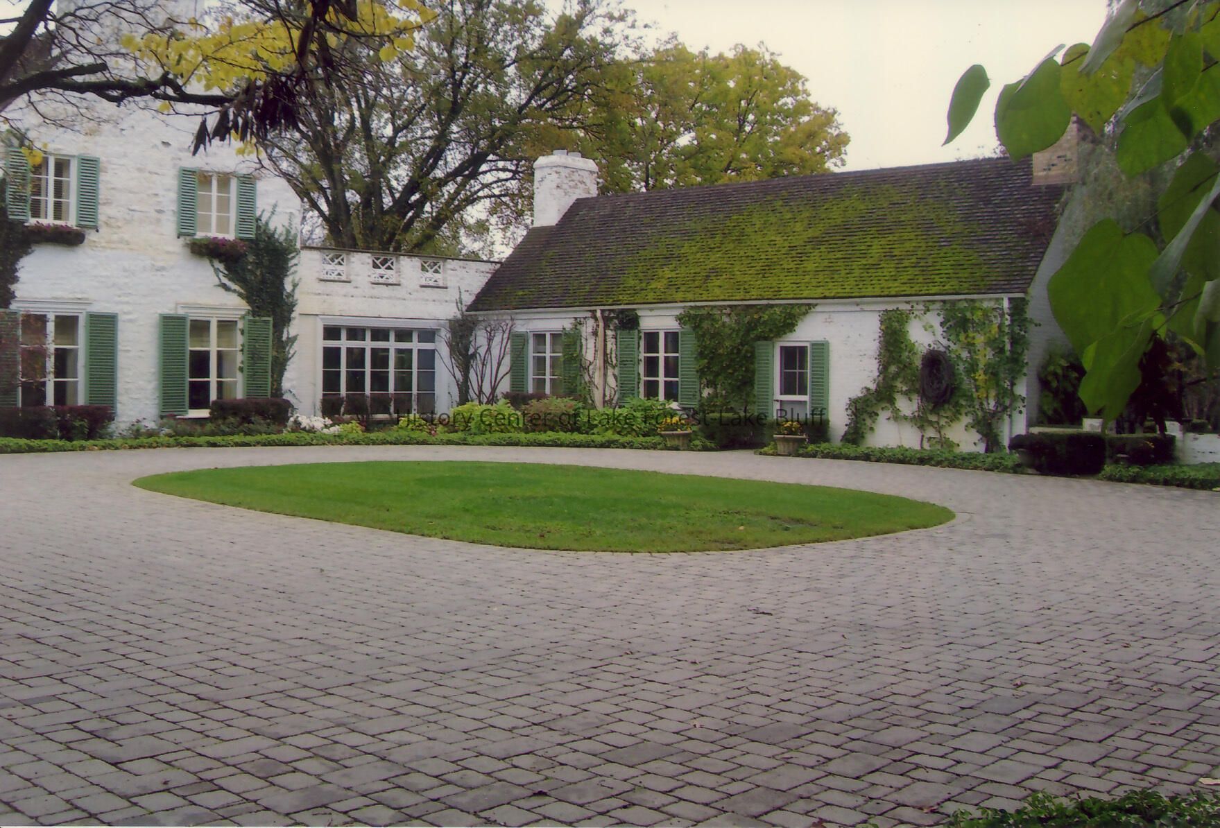 Exterior view from drive way of Walter Frazier home built for James and Betsy Getz in 1939. Located at 850 Riverwoods Road in Mettawa, Illinois.