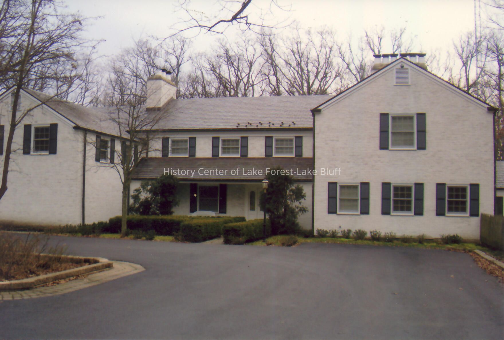 Exterior view from drive way of Walter Frazier home built for James Beach Clow in 1940. Located at 1550 N. Greenbay Road in Lake Forest, Illinois.