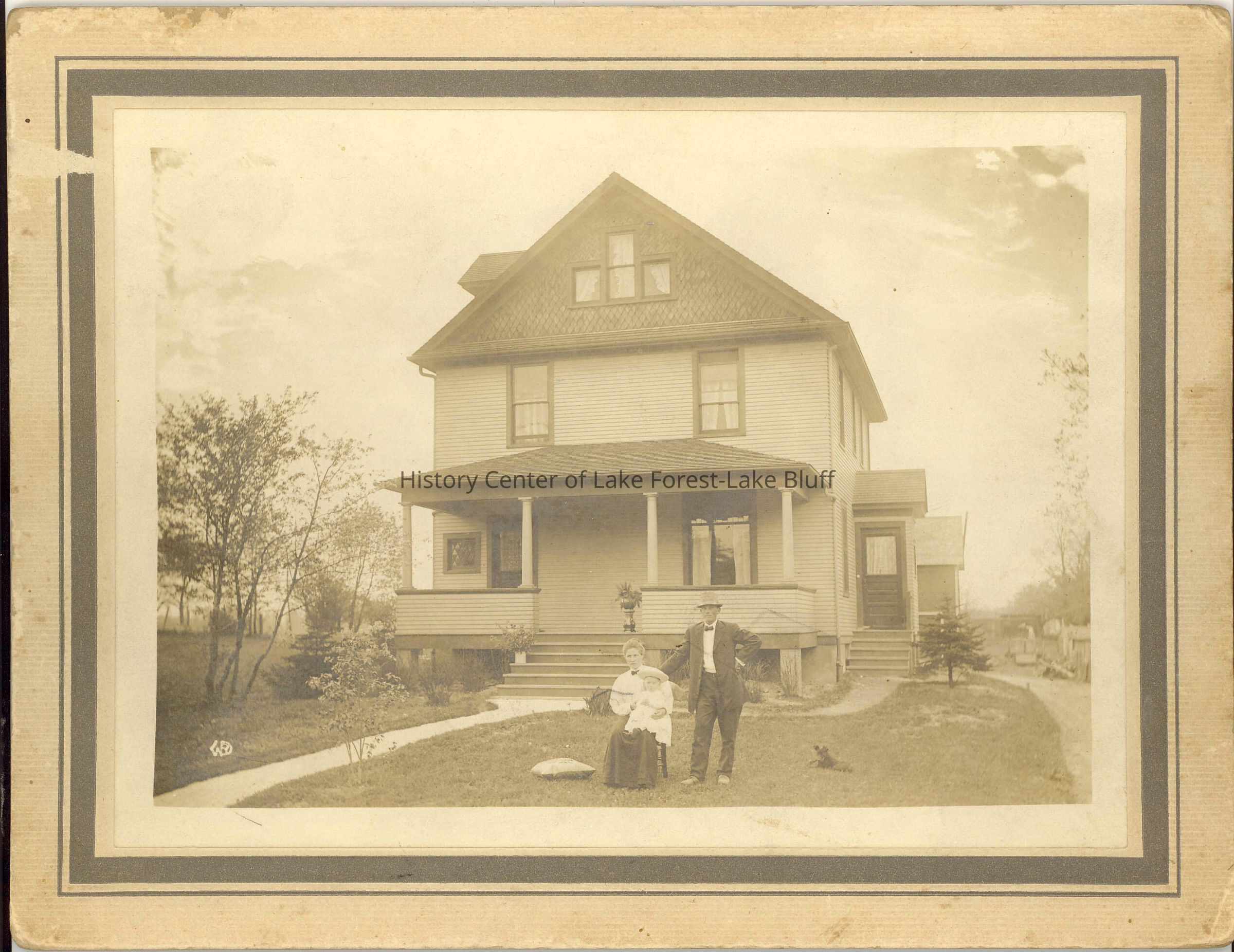Black and white photograph of home at 304 Noble Avenue, Lake Forest, two story residence with peaked roof. Johanne Johnson Hansen is seated with baby George "Bump" Hansen on her lap, with father George Hansen standing.
