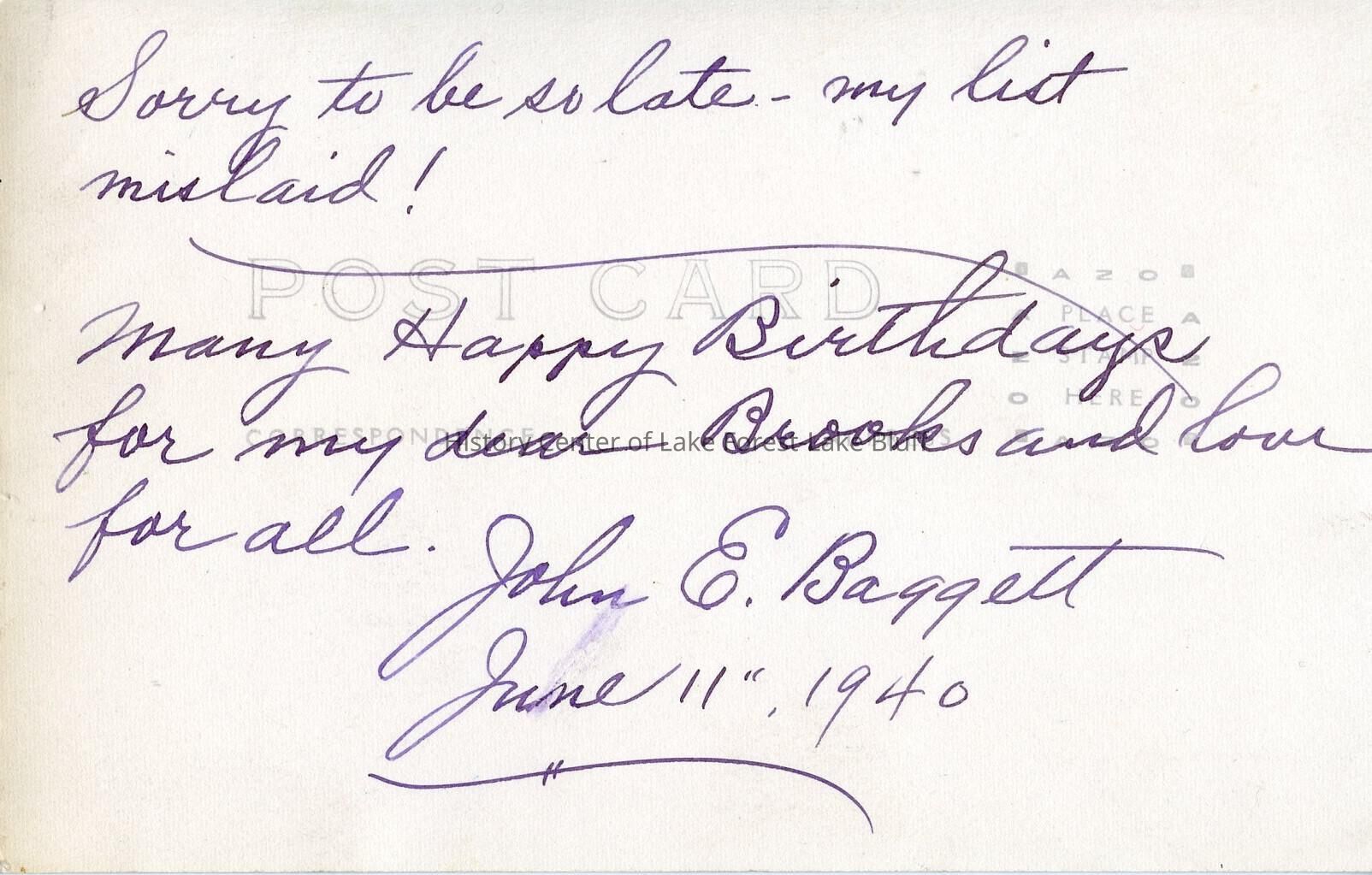 Sorry to be so late-my list mislaid! Many Happy Birthdays for my dear Brooks and love for all. Signed John E. Baggett, June 11, 1940