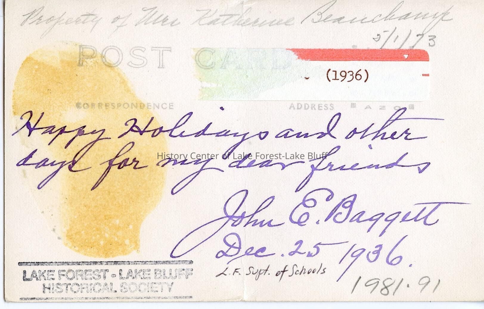 Happy Holidays and other days for my dear friends. Signed John E. Baggett, December 25, 1936