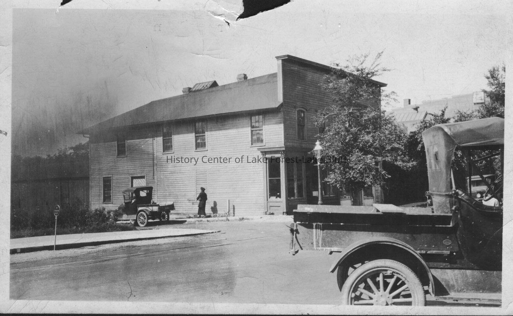 Exterior image of John E. Fitzgerald Plumbing and Heating, black and white. Side view, two cars in picture as well as a person walking along the side of building. Building located on the southwest corner of Deerpath and Bank Lane.