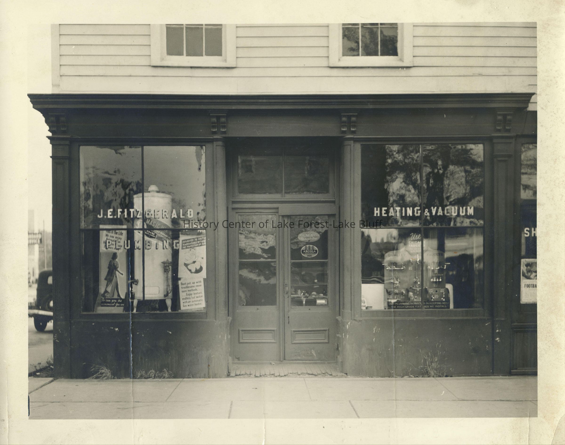 Entrance to John E. Fitzgerald Plumbing, Heating and Vacuum, car fender visible to one side.